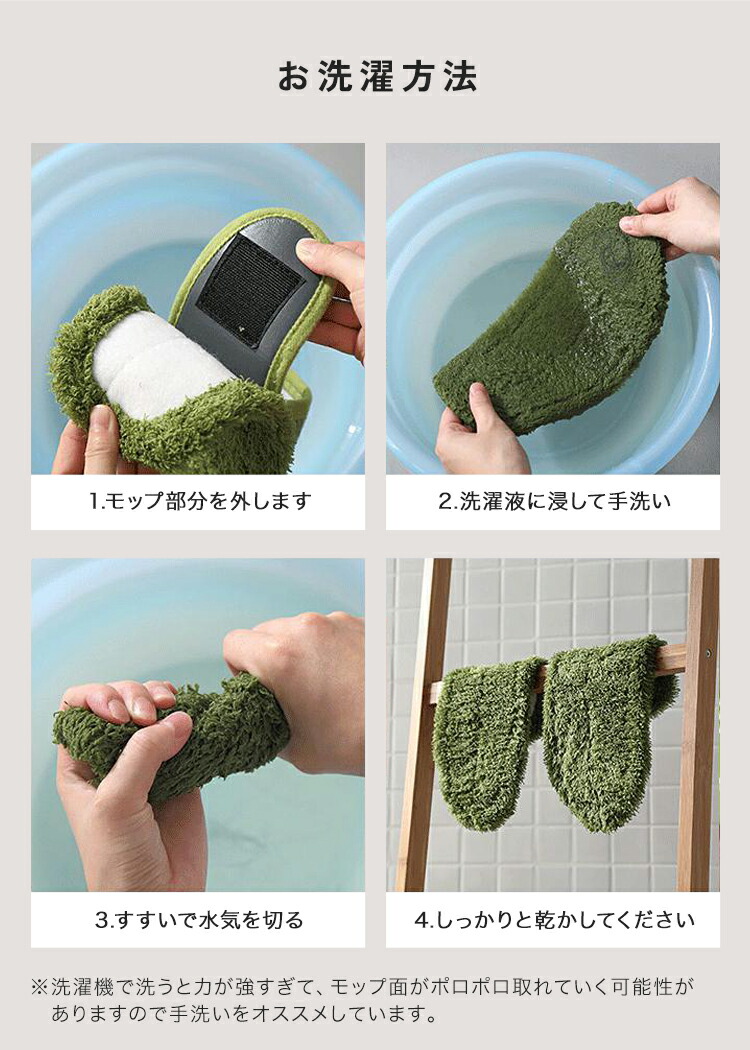 洗濯機で洗うと力が強すぎてモップ面がポロポロ取れていく場合がありますので手洗いをおススメします。サイズ 全長 約28.5cm × 全幅 約13cm(モップ込み)