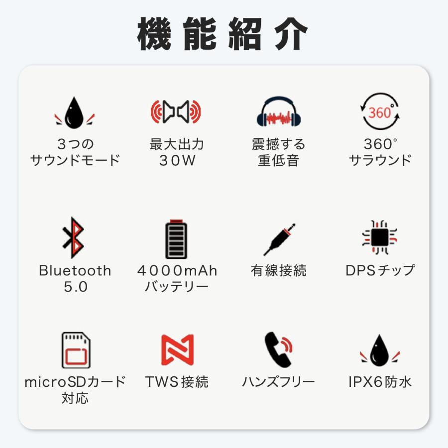 スマートフォン スマホ 重低音 高音 透明感 響く30W 安定接続 しっかり聴こえる 大容量バッテリー 連続再生 4000mAh ハンズフリー 電話 大き目ボタン 簡単操作 高級感 シンプル デザイン モード切替 防水 IPX6 2台同時接続 360°サラウンド 有線接続 microSD アフターサポート 保証 スピーカー サウンド 臨場 bluetoothスピーカー ブルートゥーススピーカー パソコンスピーカー Bluetooth おしゃれ ワイヤレス iPhone iPad android PC パソコン サラウンド ゲーム機 接続 設置 小型 おうち時間 AUX USB 送料無料 聞きやすい クリスマス ギフト 誕生日 プレゼント バースデーホワイトデー お返し 母の日 こどもの日 父の日 アウトドア バーベキュー ブラック 黒