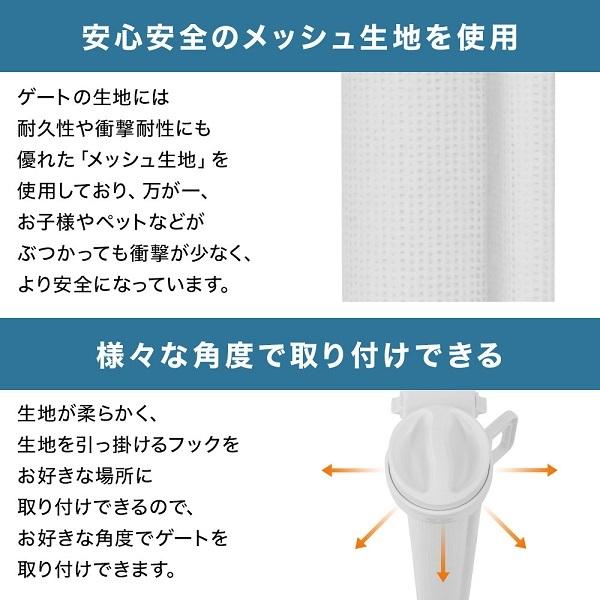 生地が柔らかく、生地を引っ掛けるフックをお好きな場所に取り付けできるので、お好きな角度でゲートを取り付けできます。