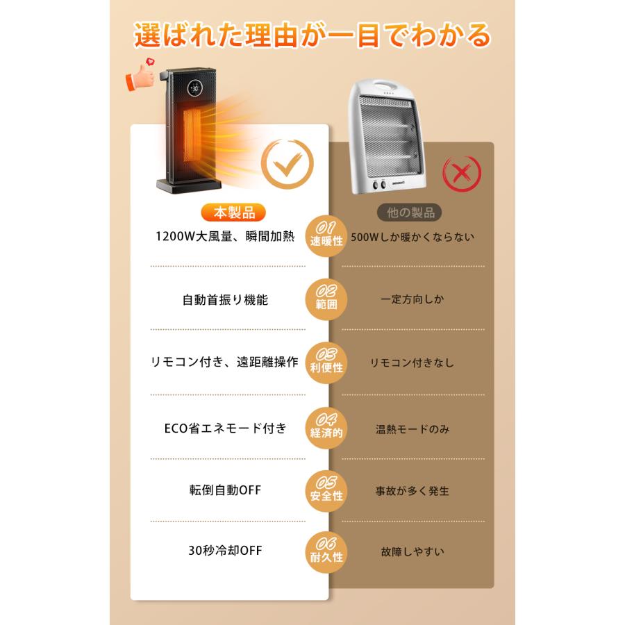 【安心安全】PSE認証済過熱保護転倒自動off機能付いています。過熱保護:ヒーター内部の温度が130℃を超えたら、自動が切れます、温度を降りました後、PTCセラミック発熱体が稼働続きことができます。転倒自動OFF:不意の衝撃や地震などでヒーターが倒れても自動で電源が切れるので、ベービーやペットがいる家庭でも安心にご使用頂けます。