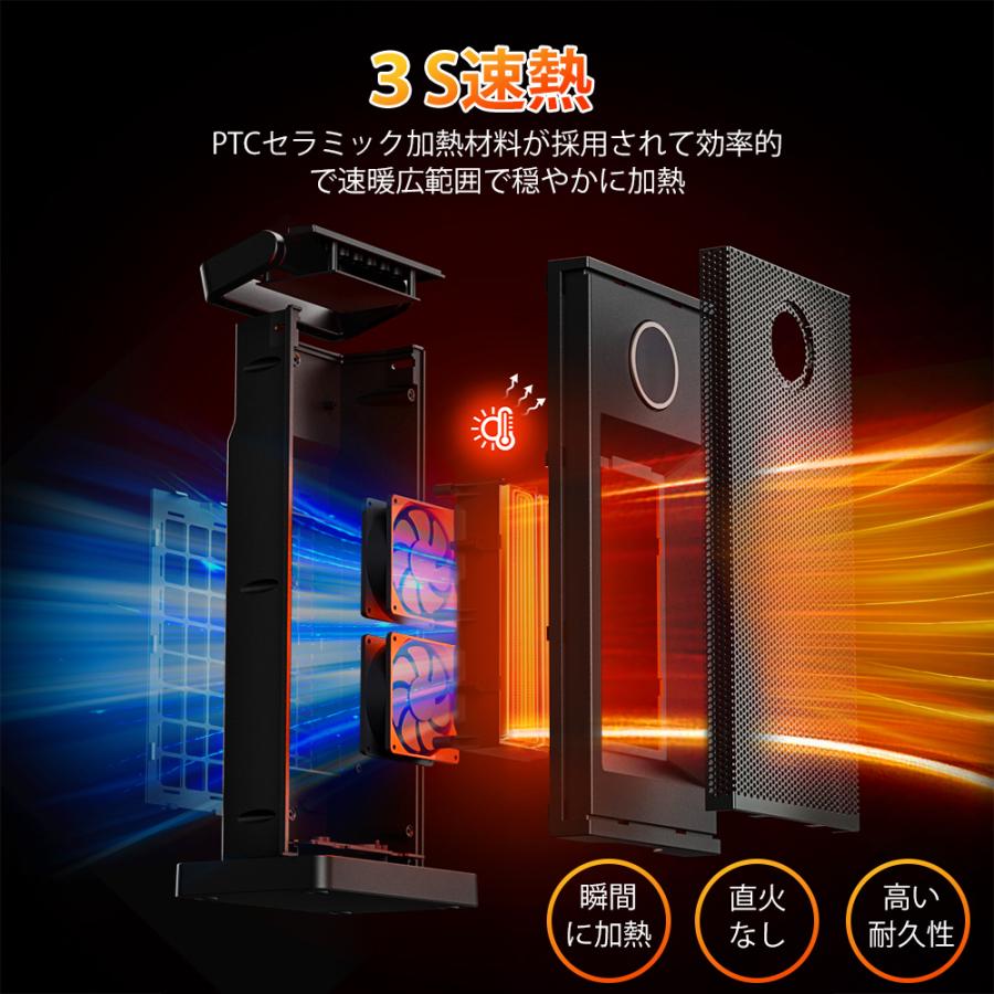 【高効率圧倒的速暖】PTCセラミック発熱体を採用することで、電熱転換率を向上させ、素早く加熱でき、電気式なので、コンセントを差し込んで、強温風モードを選択して3-8秒間に暖かくなります!肌寒さを感じた時や、朝起きや、キャンプ泊や、帰宅など、長まるまでの時間が短く、冷え性の女性や、すぐに暖まりたい人におすすめ!