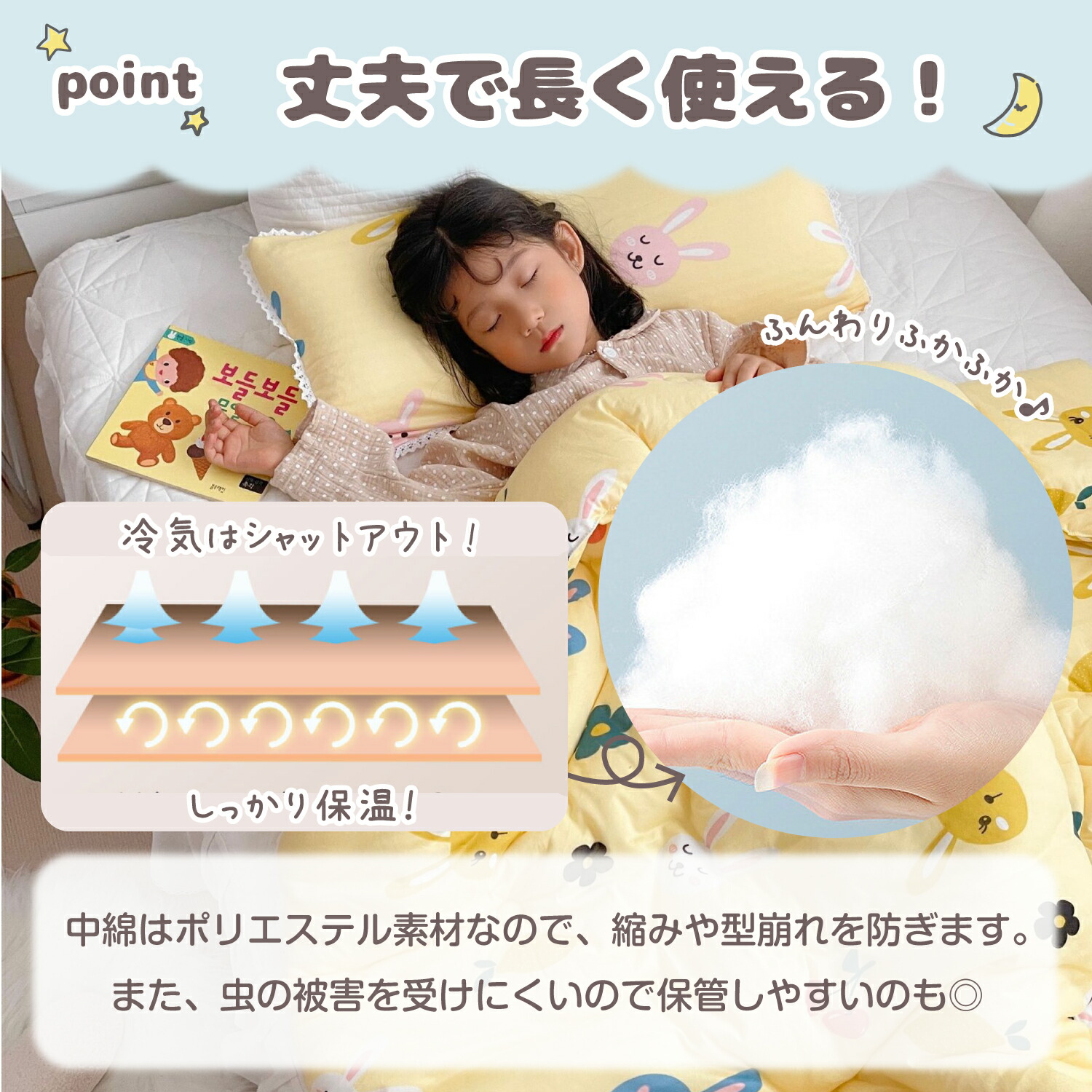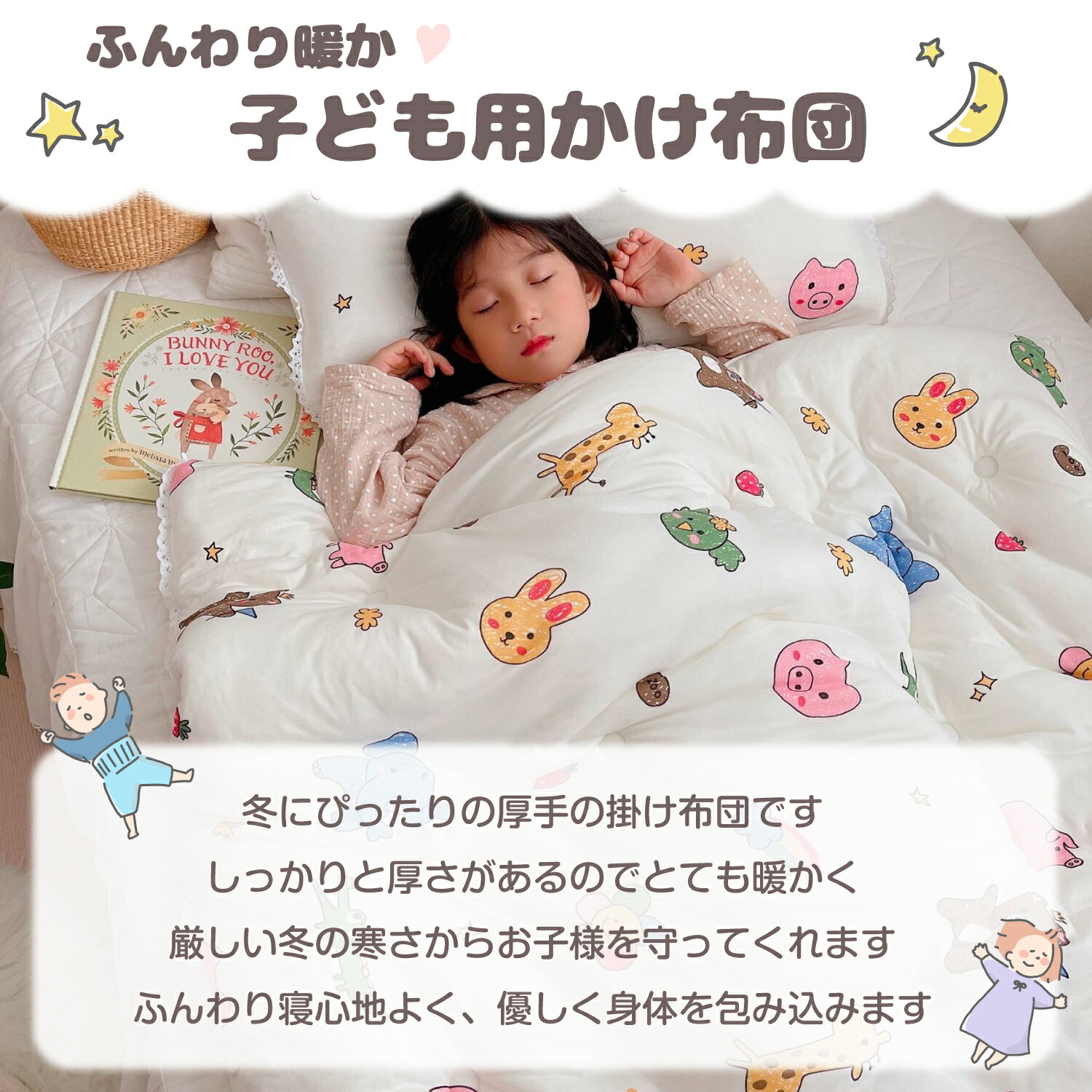 ふわふわで肌触りも良く、冬にぴったりの厚手の掛け布団です。しっかりと厚さがあるので厳しい冬の寒さからお子様を守ってくれ、とても暖か。厚手で寝心地もよく、ふんわりとお子様の身体を包み込みます。