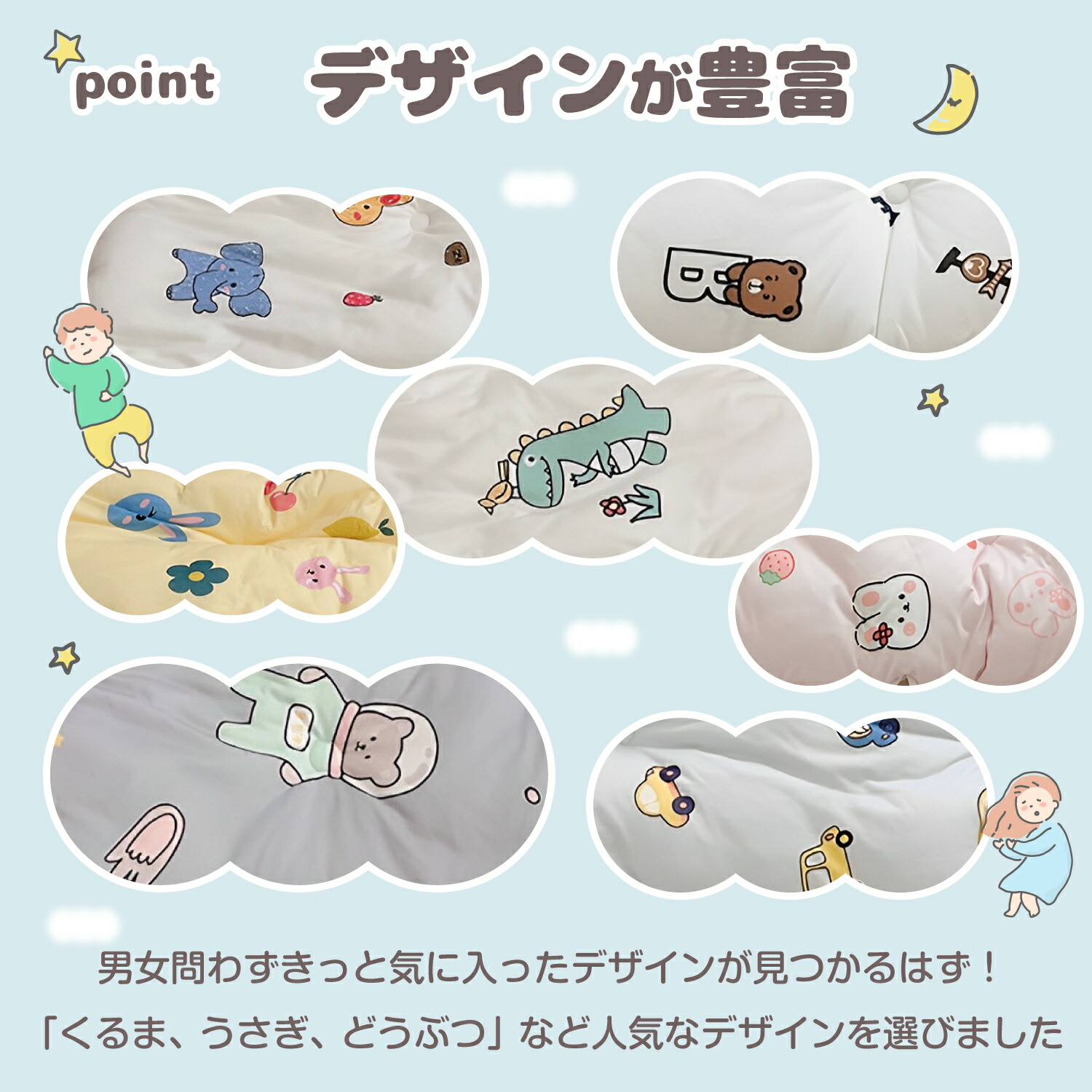 デザインが豊富なので性別を選ばすにお使いいただけます。「くるま、うさぎ、どうぶつ」などお子様に人気なデザインを選別しました。きっとお気に入りが見つかります♪