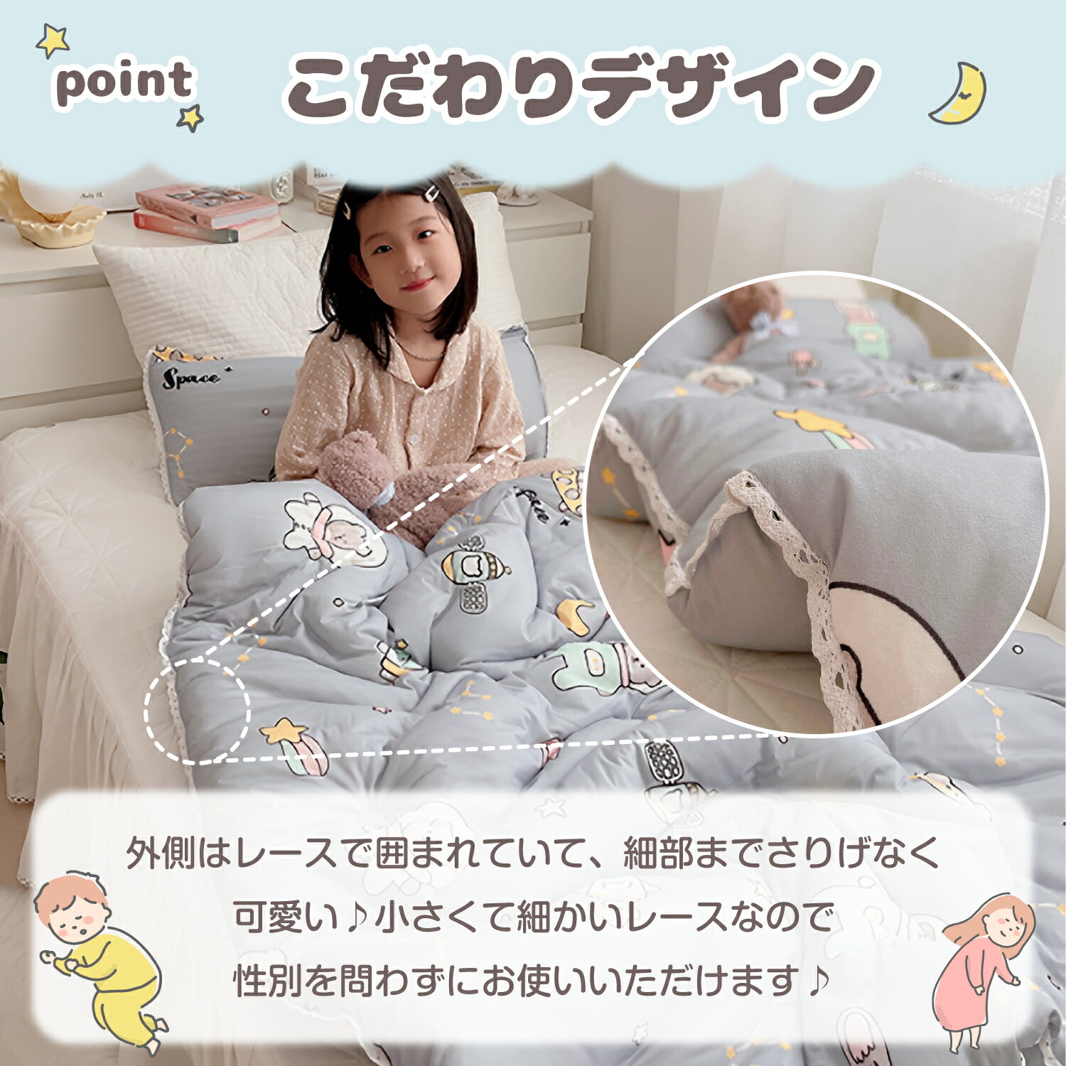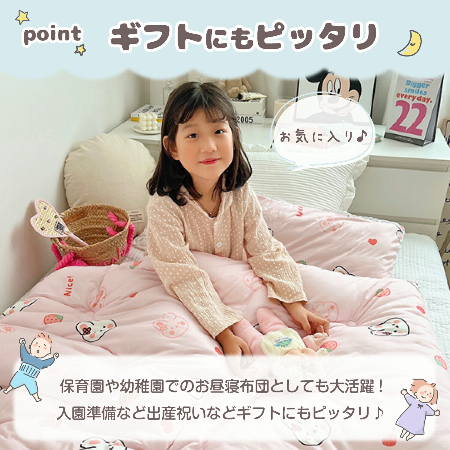 保育園や幼稚園でのお昼寝布団としても大活躍です。入園準備や出産祝いなどギフトにもピッタリです♪