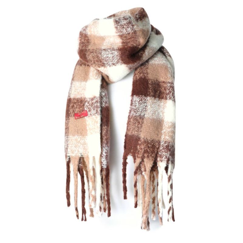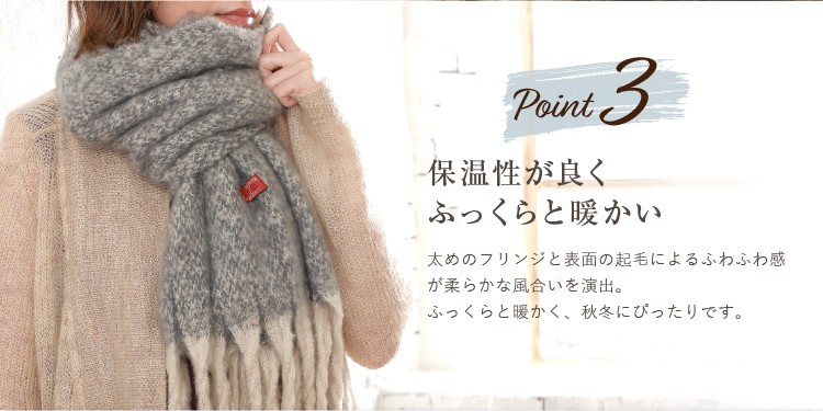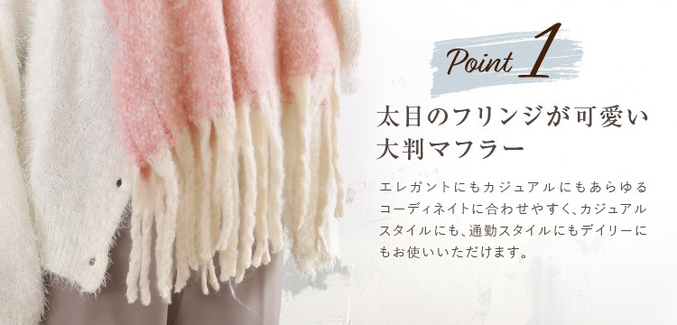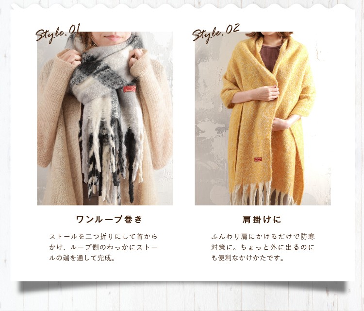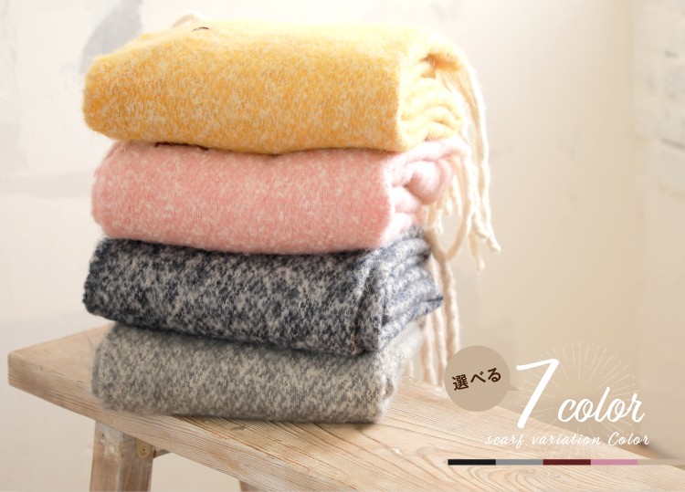 秋冬のあったか&かわいいストール♪ 2柄の全7色秋冬カラーのふんわりあったか大判マフラー。シンプルな杢カラーと大きなチェックがかわいいブロックチェックの2柄長さ180cm、幅50cmと面積が大きめで、肩に覆ったりしたり、首に巻いたり、ときには膝掛けに使ったりと色々な用途に使えて便利です。カジュアルスタイルにも、通勤スタイルにもデイリーにも。個性的な雰囲気のデザインが可愛いです♪♪女性にも、男性にもオススメです。
