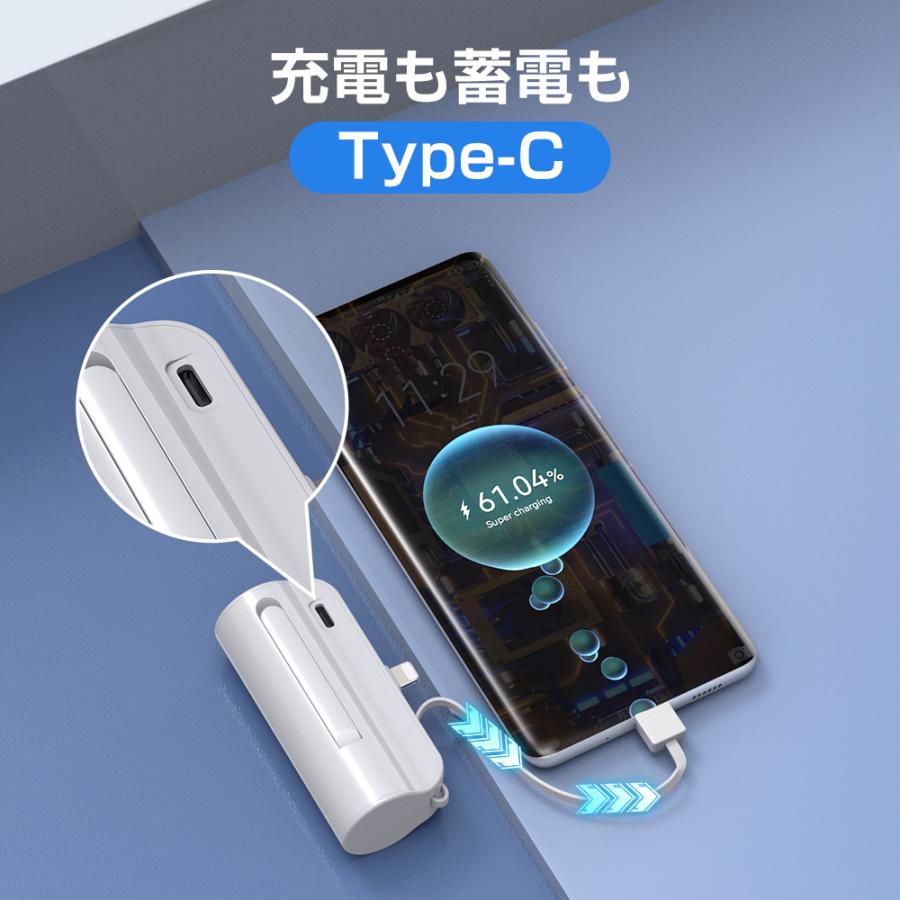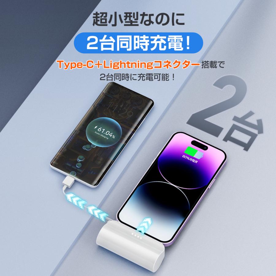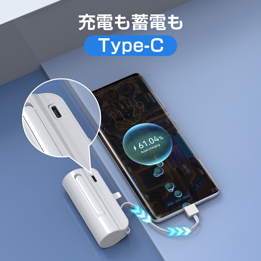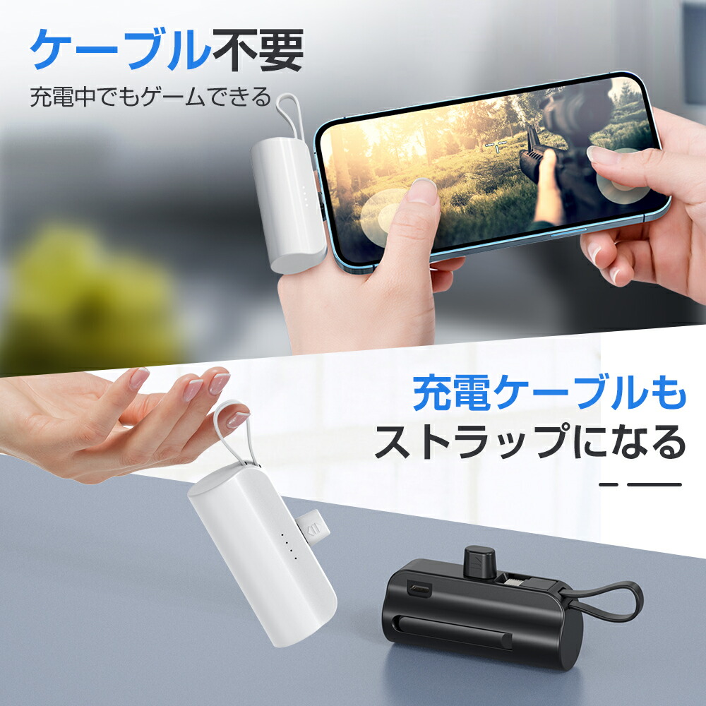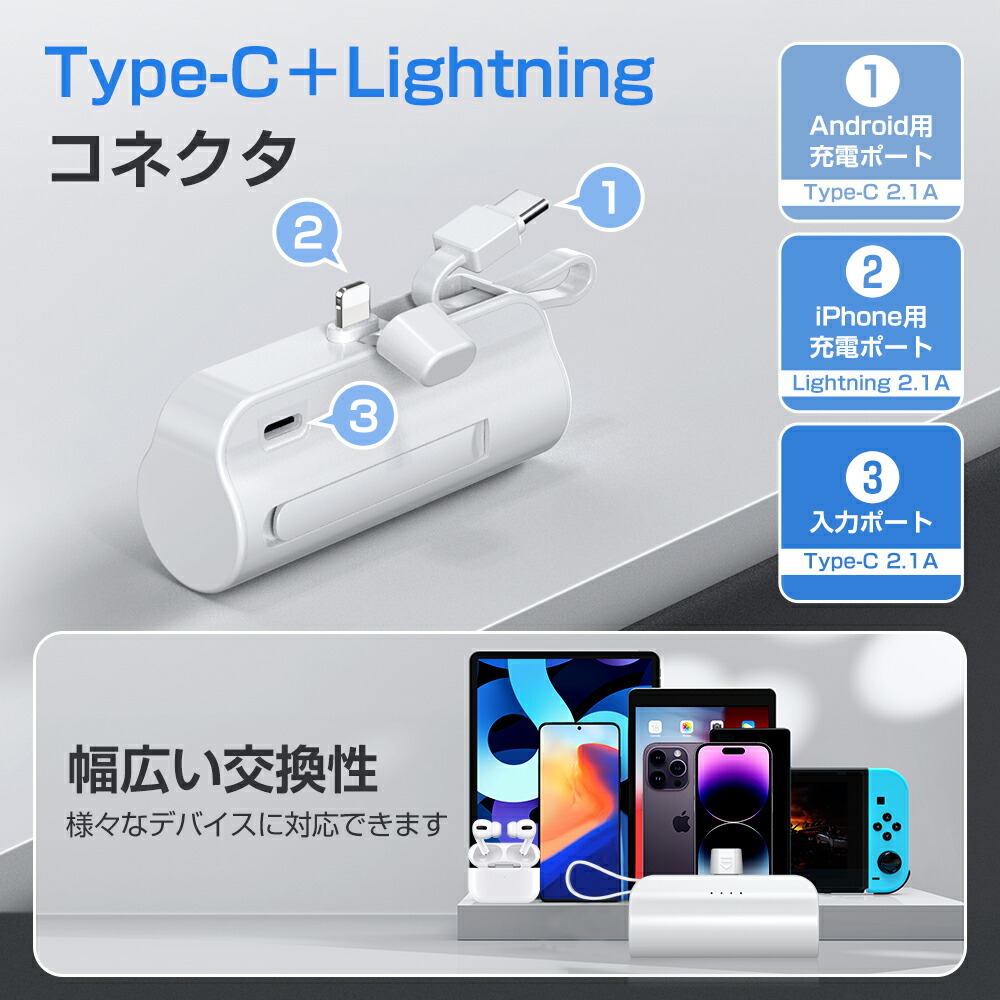 モバイルバッテリー 大容量 5000mAh ケーブル内蔵 iphone用 充電器 超軽量 小型 2台同時充電 スマホ充電器 Type-C Lightning ケーブル内蔵 携帯充電器 防災用品