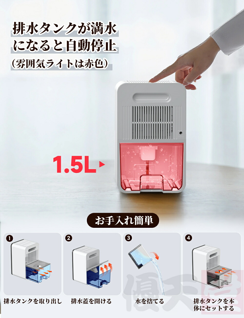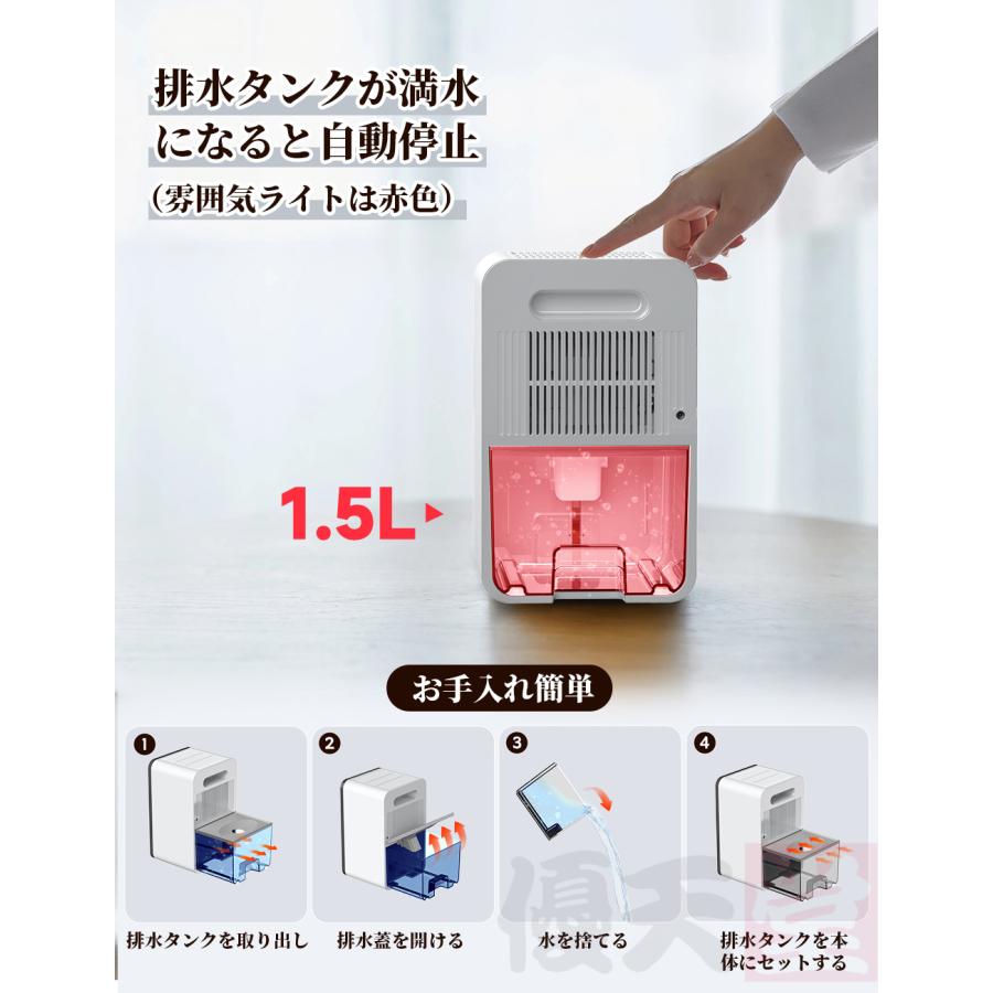 小型除湿機!引き出し式排水タンク、排水ラクラク。背面は透明デザインで水位一目瞭然。満水になると自動停止機能も搭載。一つのボタンでONとOFFにでき、高齢者や子供でも使いやすい操作。さらに、わずか22.5Wの消費電力で、1時間あたりの電気代は約0.6円!経済的で省エネな除湿機。快適さを提供するほか、エネルギーや時間、お金を節約するのにも役に立ちます。【7色変換ライト静音設計】