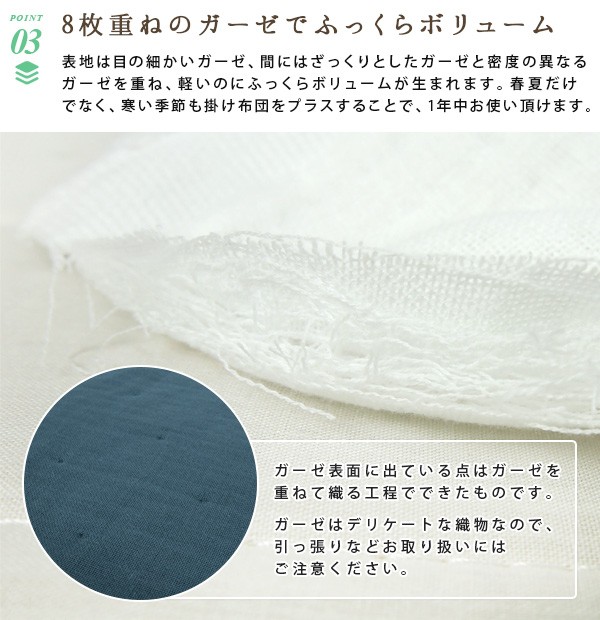 ボリュームがあるのに軽いので重苦しいさを感じません。8層に重ねて織られたガーゼが空気をたっぷり含むことで保温力も生まれ、適度な温度に保ちます。
