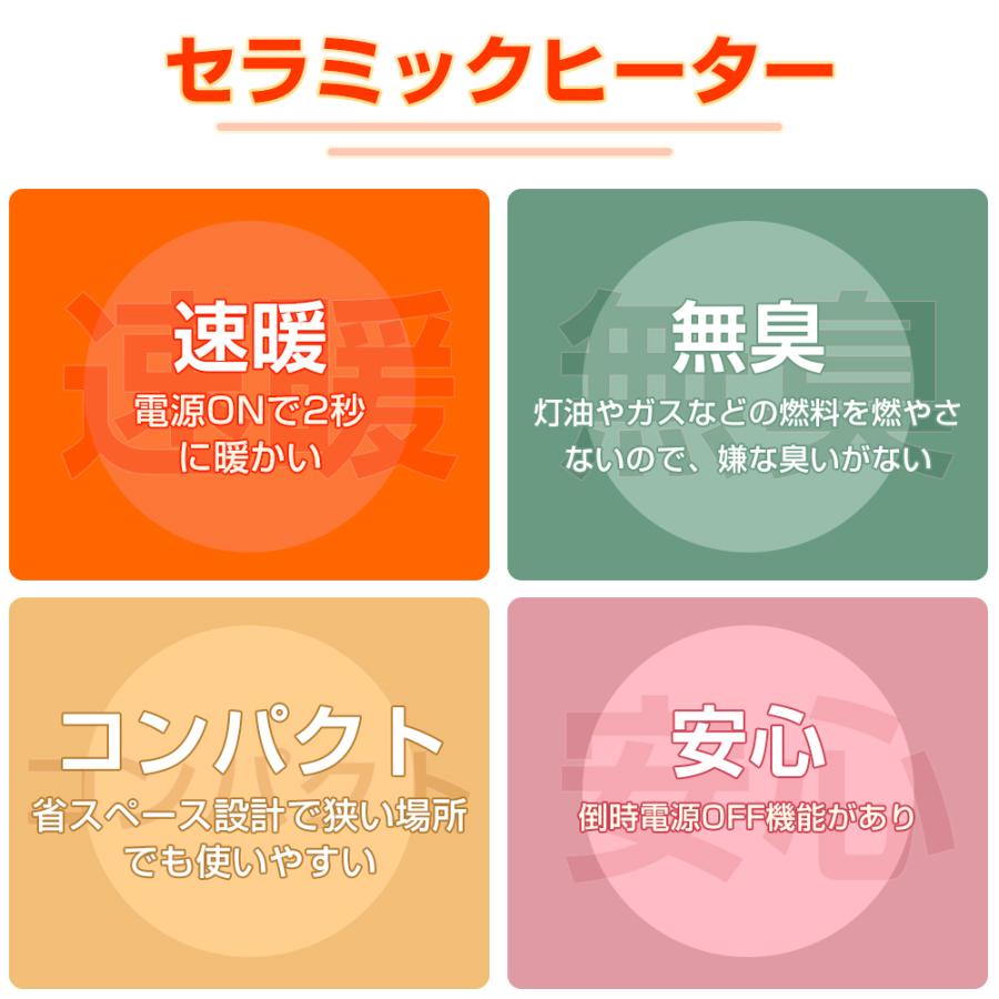 速暖性に優れたセラミックヒーターで、スイッチオン3秒ですぐ暖かい風が出ます。