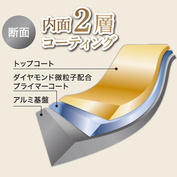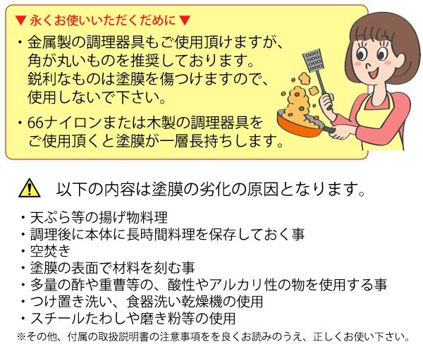 【 ダイヤモンドコーティングを長くお使いいただくために 】 金属製の調理器具もご使用頂けますが、角が丸いものを推奨しております。 鋭利なものは塗膜を傷つけますので、使用しないで下さい。 66ナイロンまたは木製の調理器具をご使用頂くと塗膜が一層長持ちします。 以下の内容は塗膜の劣化の原因となります。 天ぷら等の揚げ物料理 調理後に本体に長時間料理を保存しておく事 空焚き 塗膜の表面で材料を刻む事 多量の酢や重曹等の、酸性やアルカリ性の物を使用する事 つけ置き洗い、食器洗い乾燥機の使用 スチールたわしや磨き粉等の使用 その他、付属の取扱説明書の注意事項をを良くお読みのうえ、正しくお使い下さい。