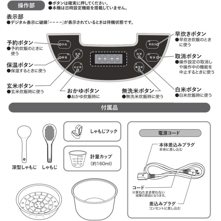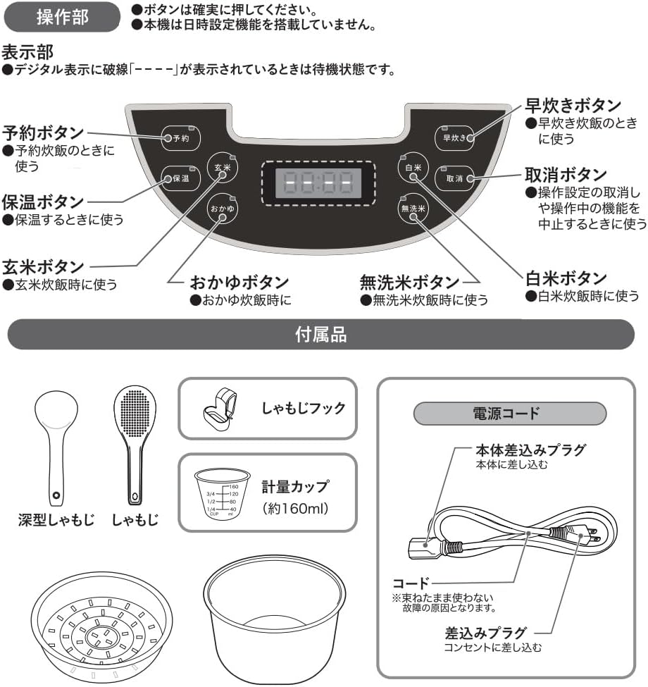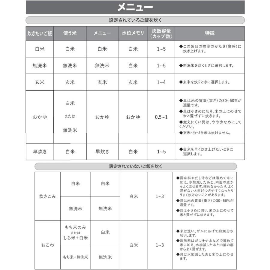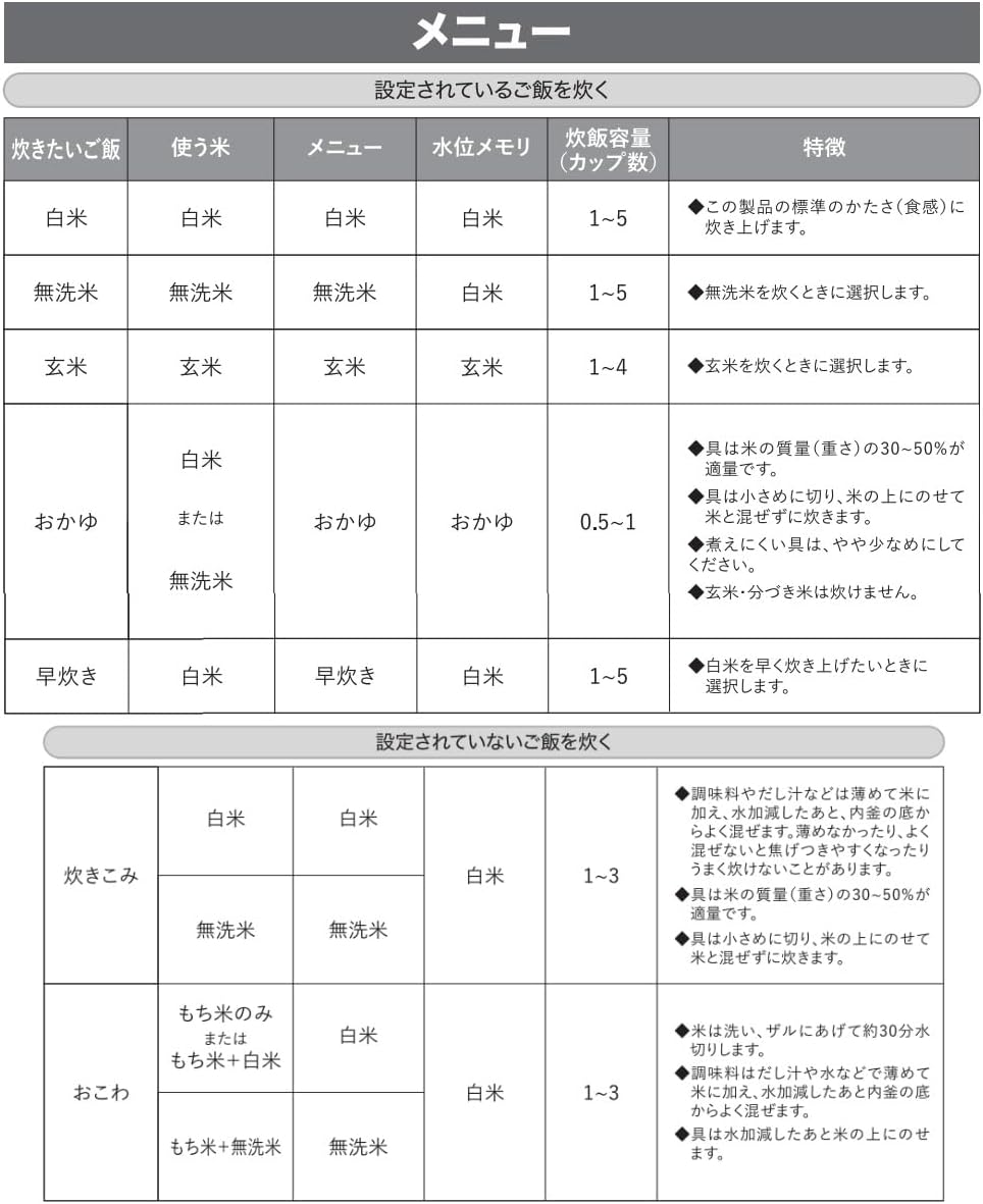 メニュー:白米、早炊き、無洗米、玄米、おかゆ