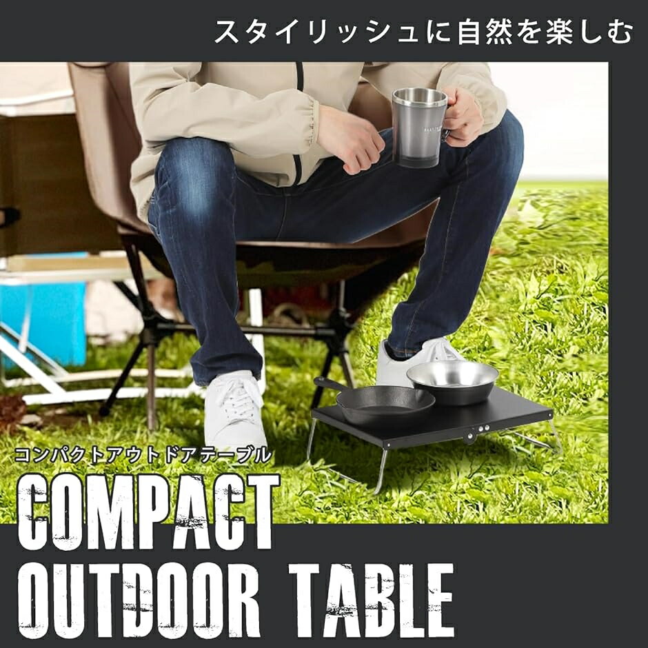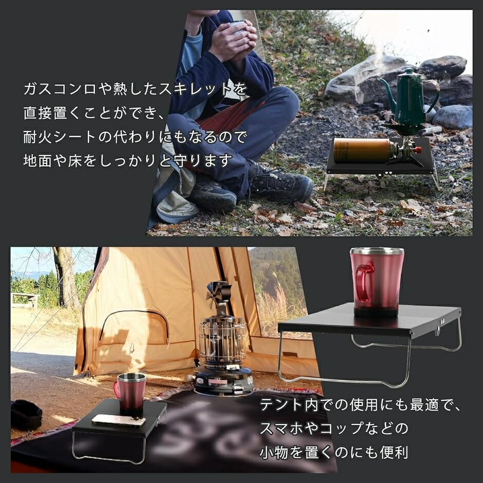 「アウトドアで大活躍」ミニサイズのアウトドアテーブルはロータイプでガスコンロ、スキレットを置くほか、テント内ではスマホやコップ、本などを置くこともできます。
