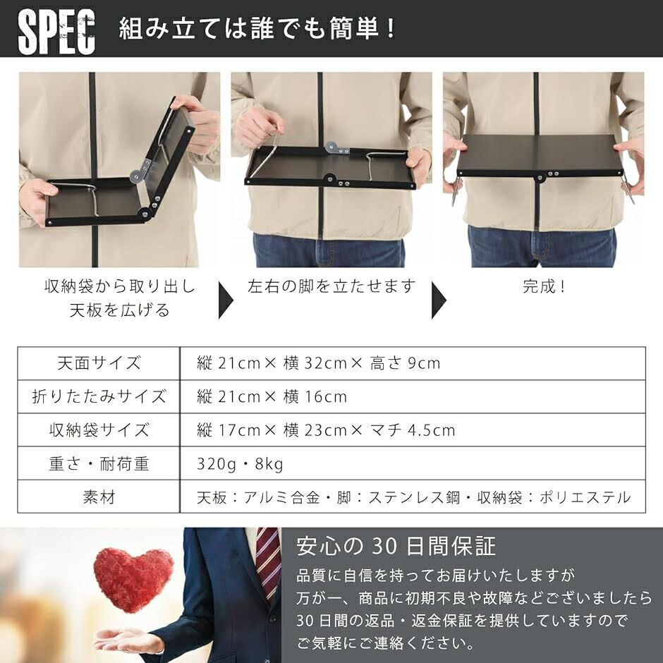 使い方は、付属の収納袋から取り出して天板を広げ、左右の脚を立たせたらすぐに使えます。
