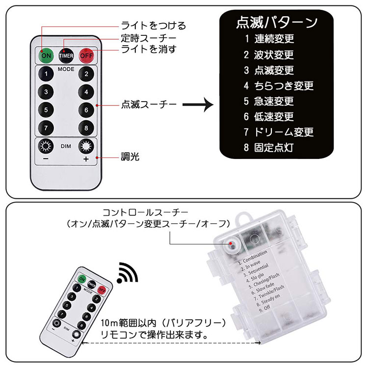 【多種類の点灯モード】全8種類の点灯パターンがあります。リモコンで、点灯パターンを設定できます。常点灯、点滅、変速しながら点滅、ブラッシュ点滅、ゆっくり調光点滅などパターンがあります、楽しく選んべます。