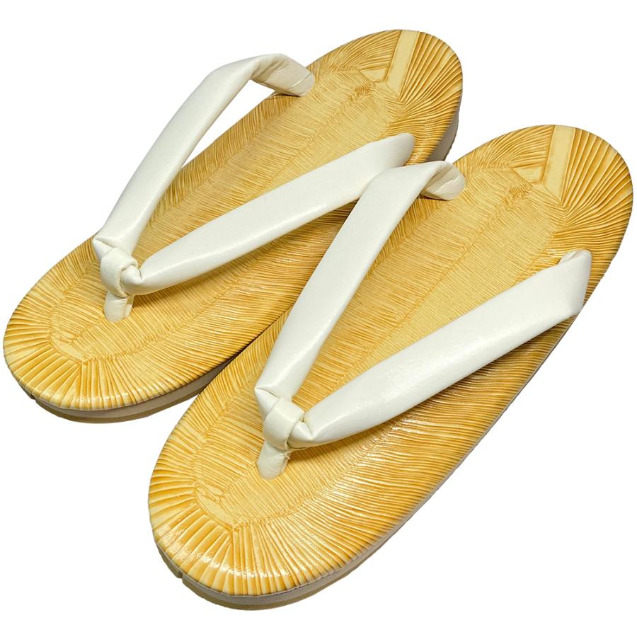 寺院用の普段履き(実用履き)として一般的に使用されている白鼻緒の草履です。裏底はサンド底(刻みのあるアウトソールを発泡スポンジに貼り合わせたもの)で、軽量かつクッション性に富んでいるため、歩きやすく踊りやすいとご好評をいただいております。