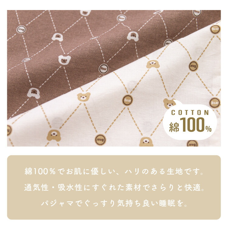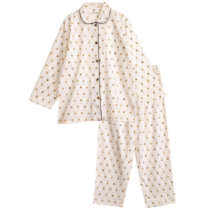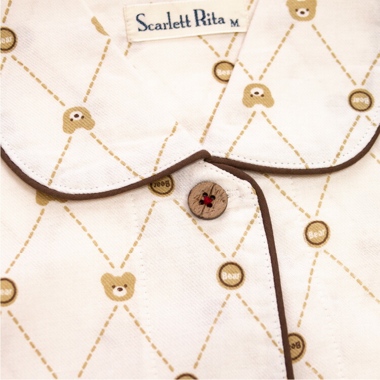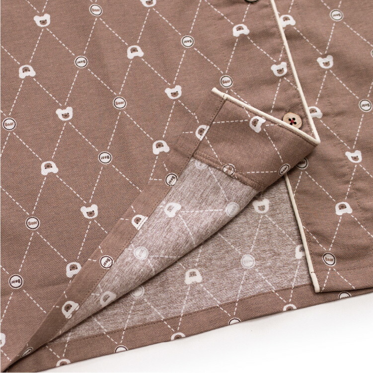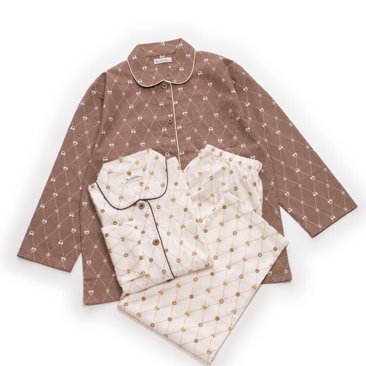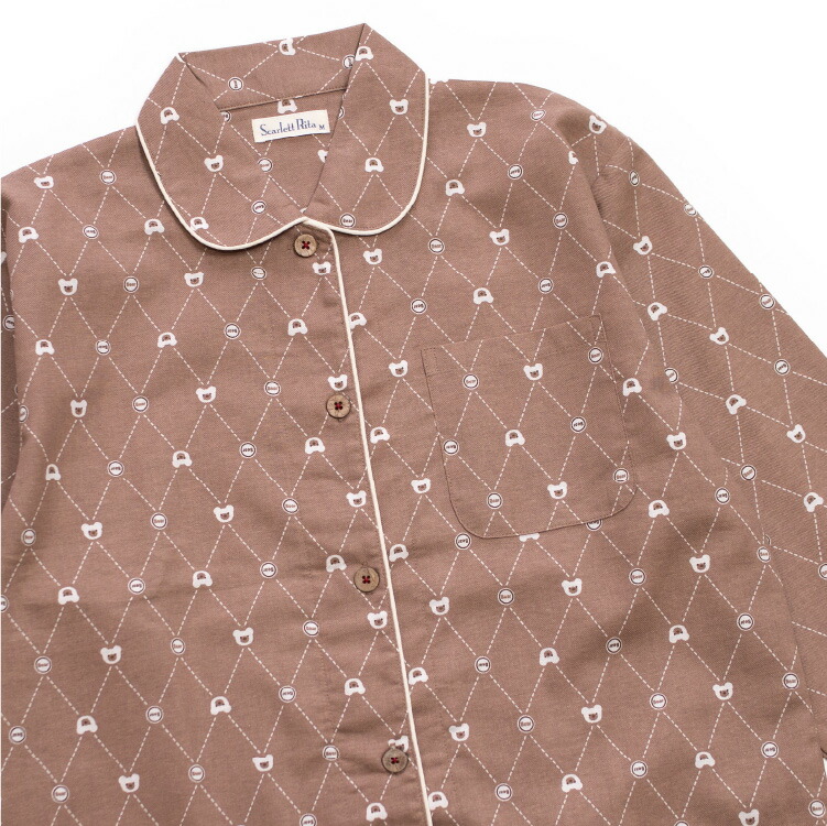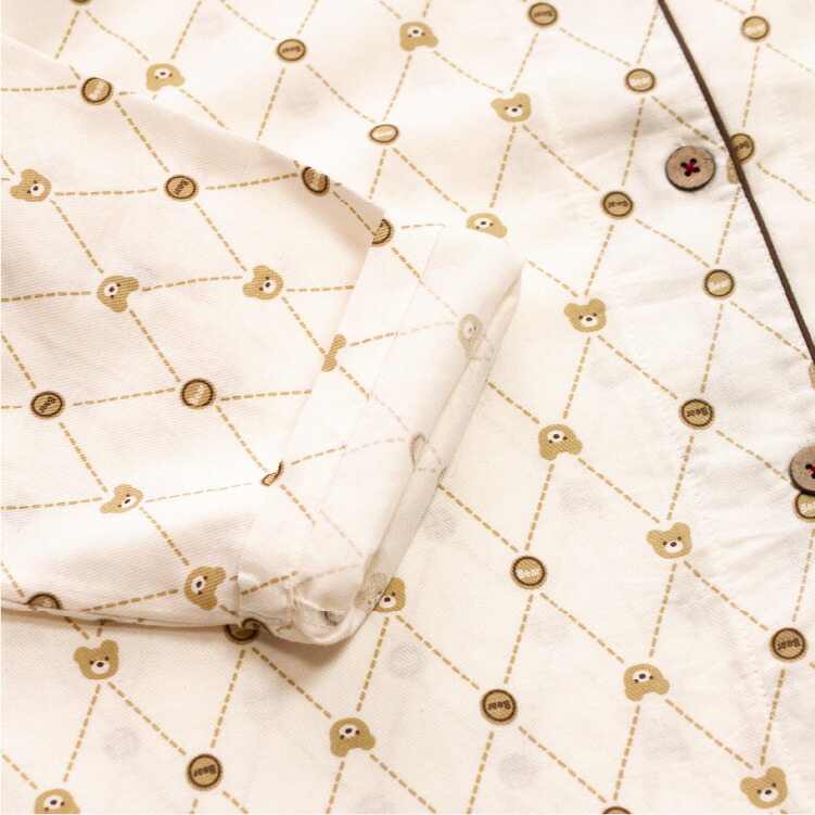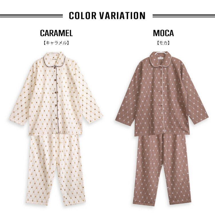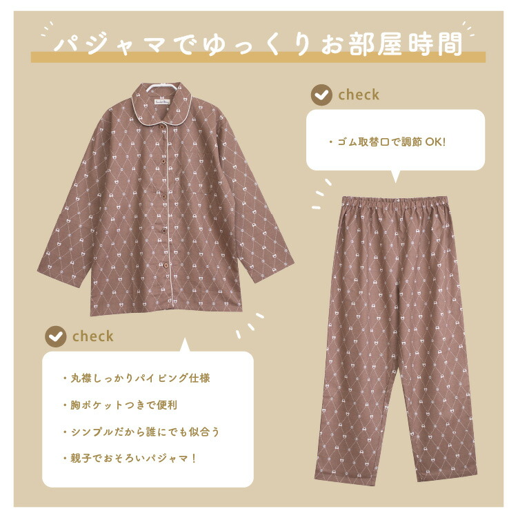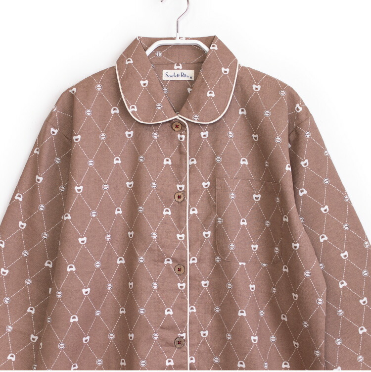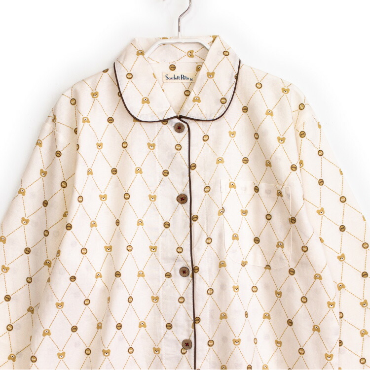 パジャマ レディース 綿100% 長袖 春 秋 前開き ほのぼのモノグラム クマ柄 キャラメル モカ M L LL 3L かわいい おそろい