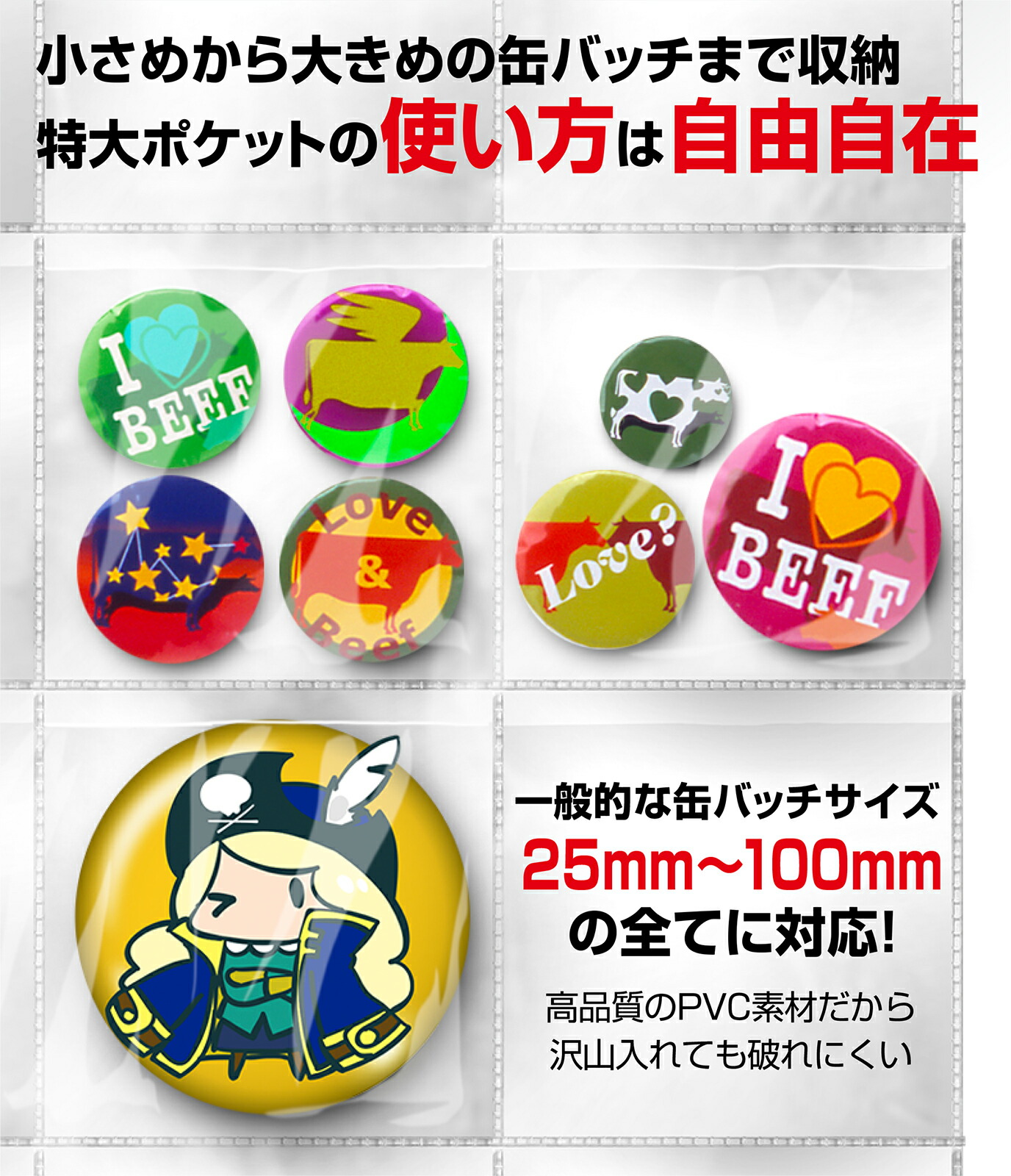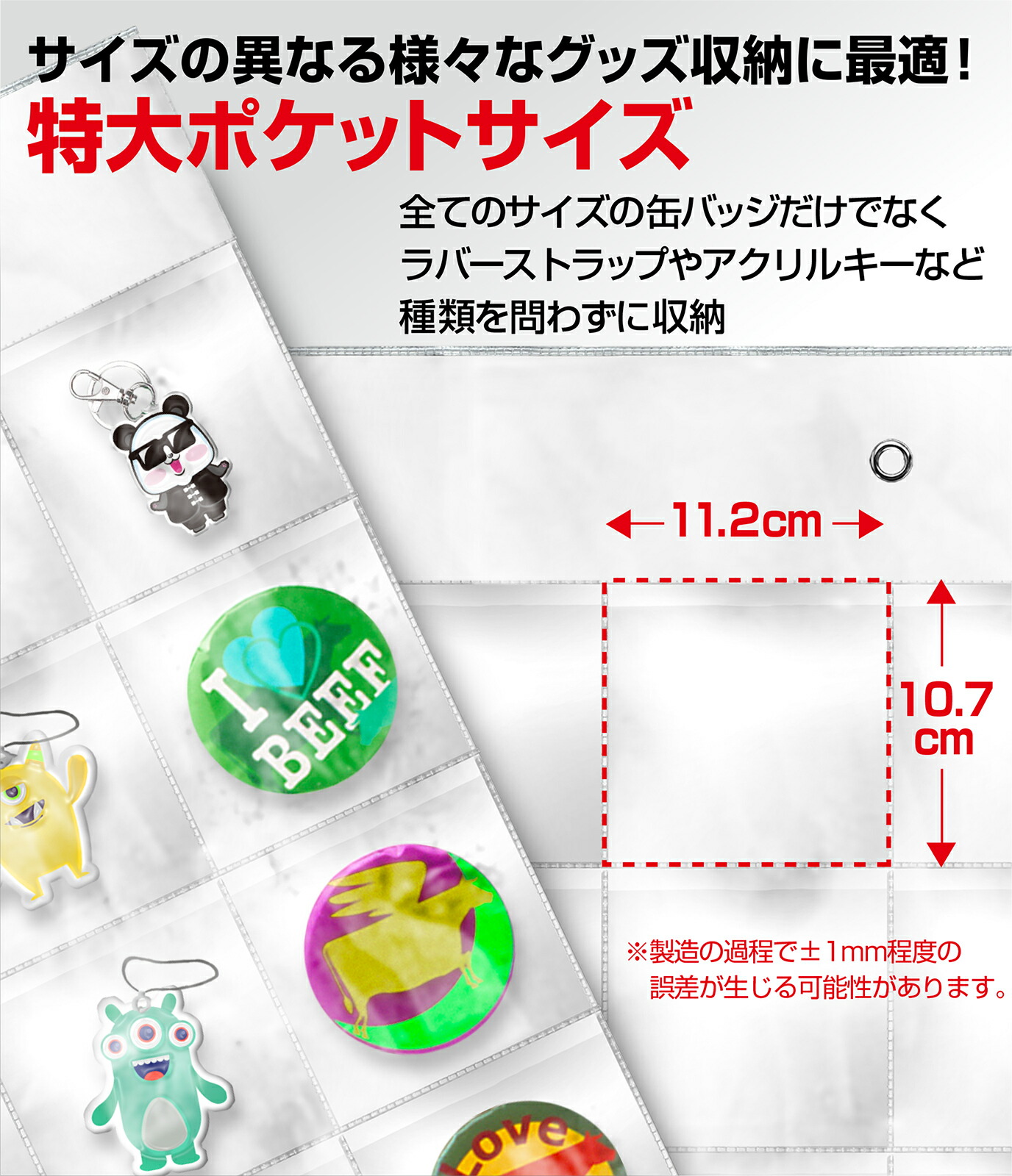 ポケットサイズが大きいため、全てのサイズの缶バッジだけでなく、ラバスト、アクキー、アクスタなどを収納できます。