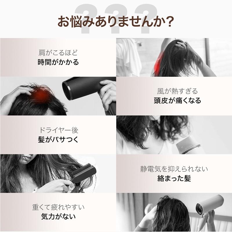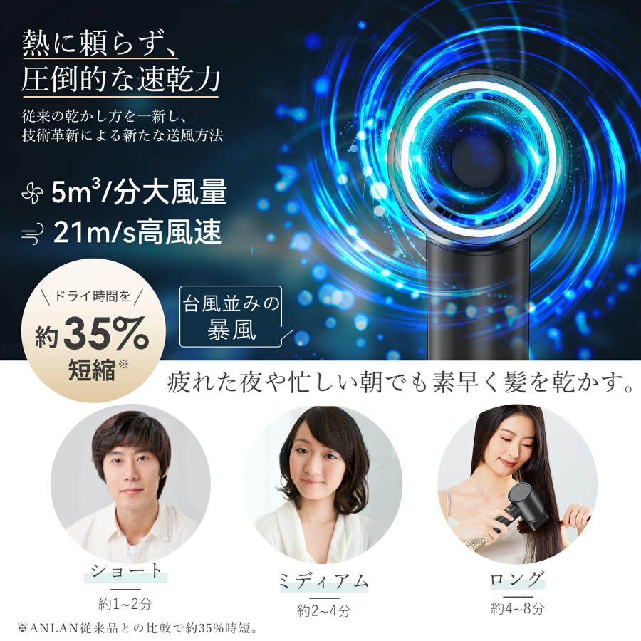 ドライヤー 大風量 速乾は最高回転数110,000rpmの高速ブラシレスモーターを搭載、ブースターチャンネルと連動して、高風速の気流を出します。素早く髪表面の水分を除去し、ドライ時間50%短縮を実現します。朝、髪を洗っても、さっと片付けて、すっきりした気持ちで出かけられます。