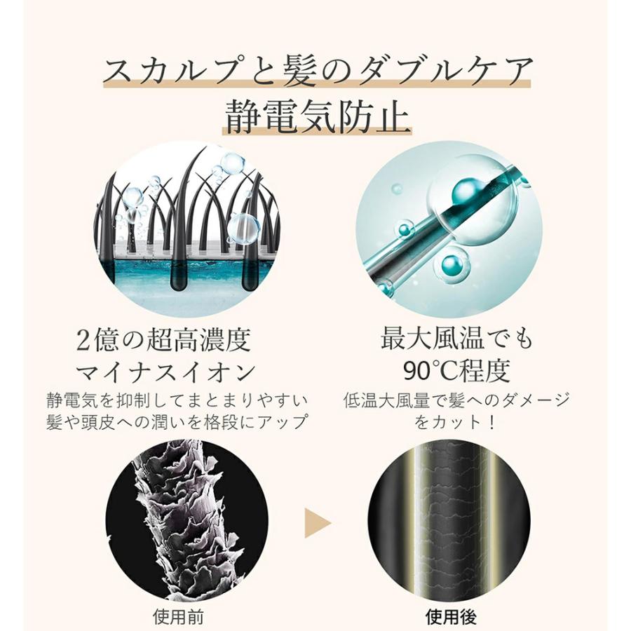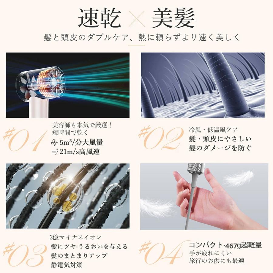 ヘアドライヤーの吹出口に搭載した2億個/cc以上の高濃度マイナスイオンが髪の潤いを守り、風熱の効果でドライ時間を大幅削減すると同時に、95%静電気を抑えることで、サロンワークの効果化を実現します。重量はたった467g(本体のみ)という超軽量設計を実現します。旅行などお出かけの際にも一緒に持っていきやすいので、かさばりにくく場所をとらないほか、軽量なので持ち運びにも便利です。