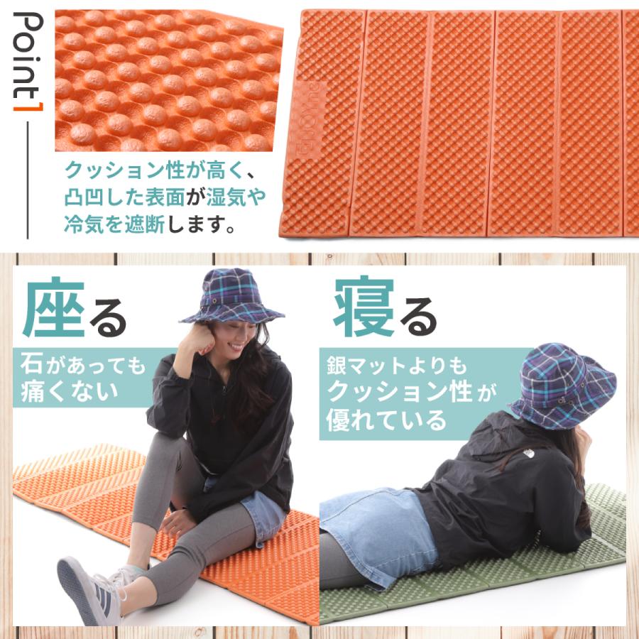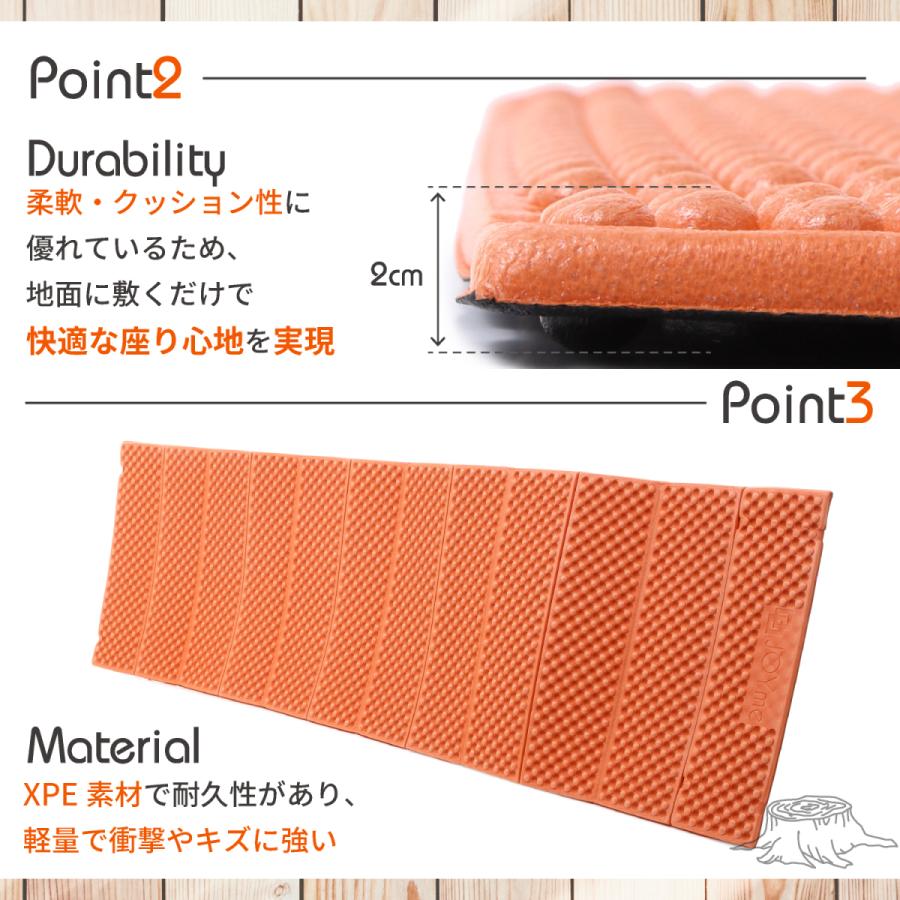 20mm(2cm)の厚手と特徴的な「凹凸製法」によりクッション性が高まり座る際に地面からの直感触をカット。凹凸部分が重みや衝撃を分散するので固いコンクリートや小石や砂利の地面でも気にせず快適に座る事ができます。春はお花見、夏は海に山に川遊びプールキャンプにフェス、秋は運動会や紅葉のハイキング、冬は年越しフェスや年末カウントダウンなど、季節問わずに1年中使用可能です!