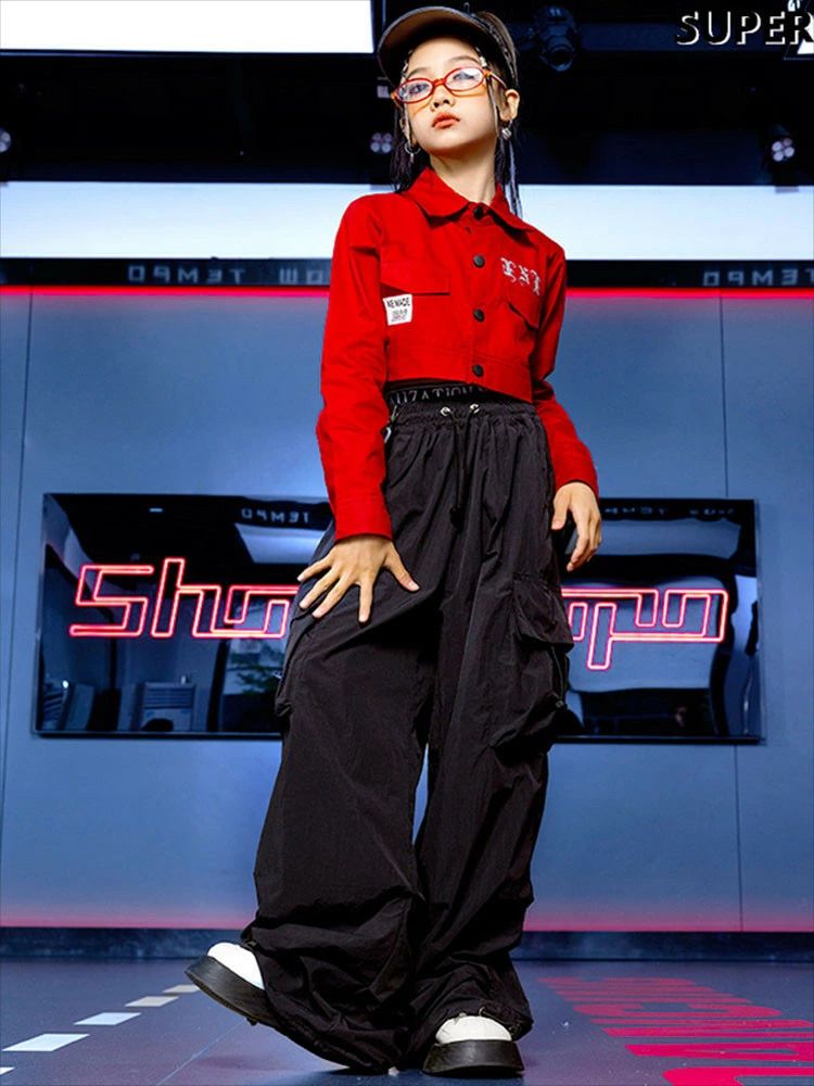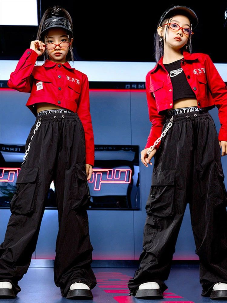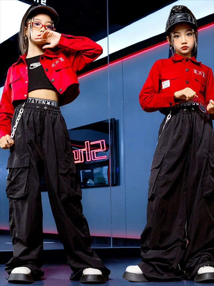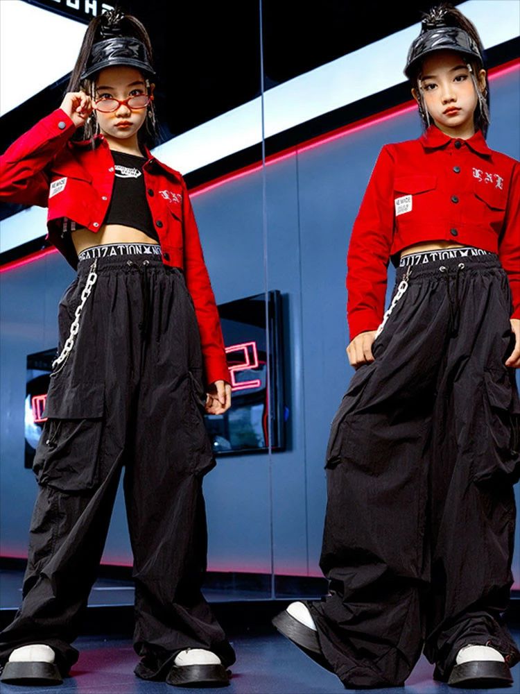 レッド ジャケット 黒 カーゴパンツ
