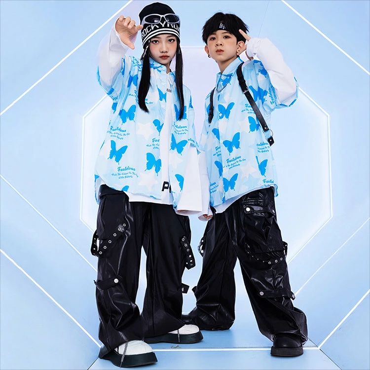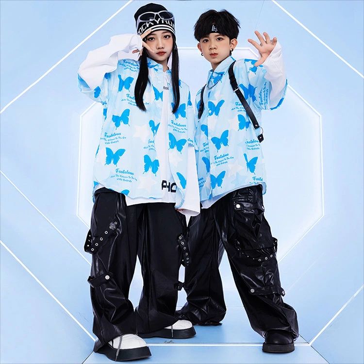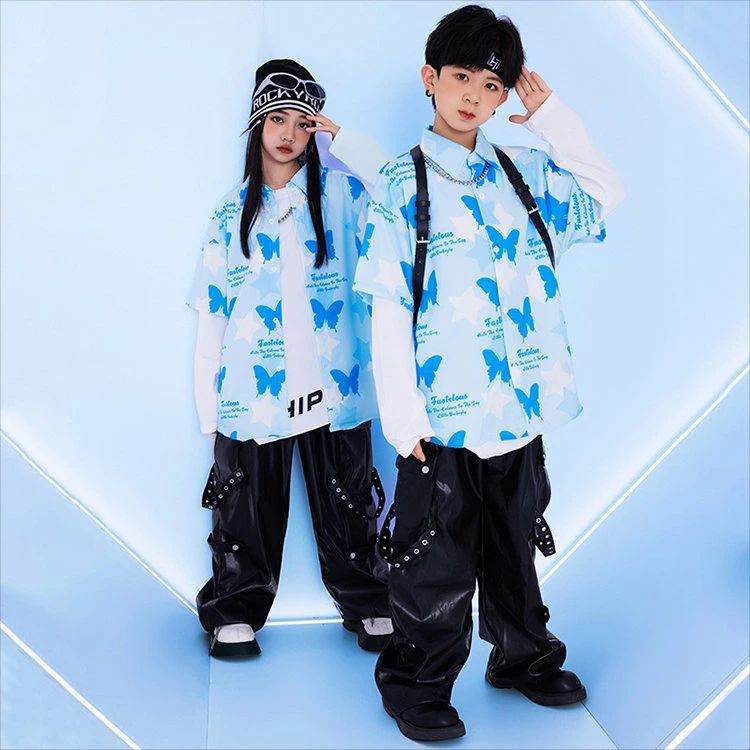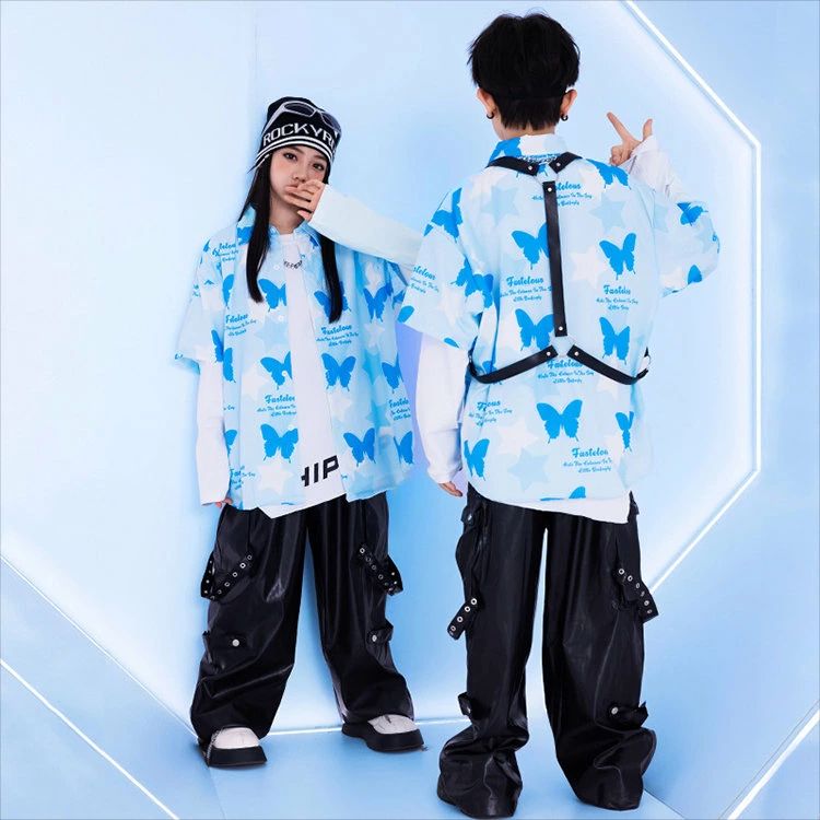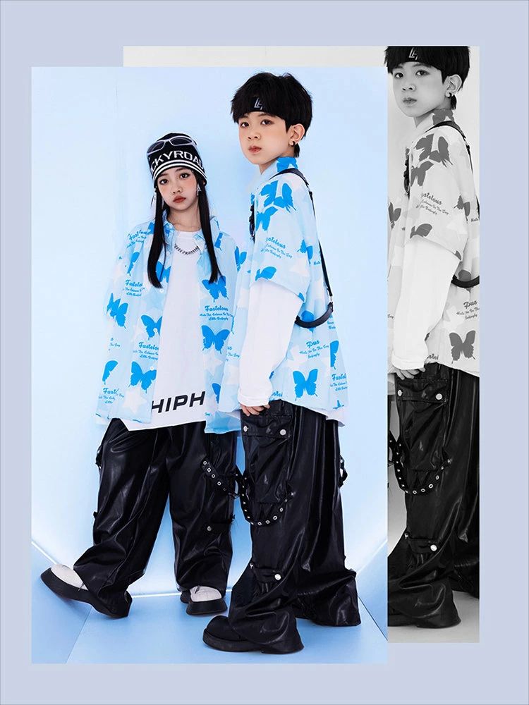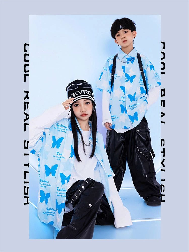 ブルー 蝶柄 総柄 柄シャツ キッズ