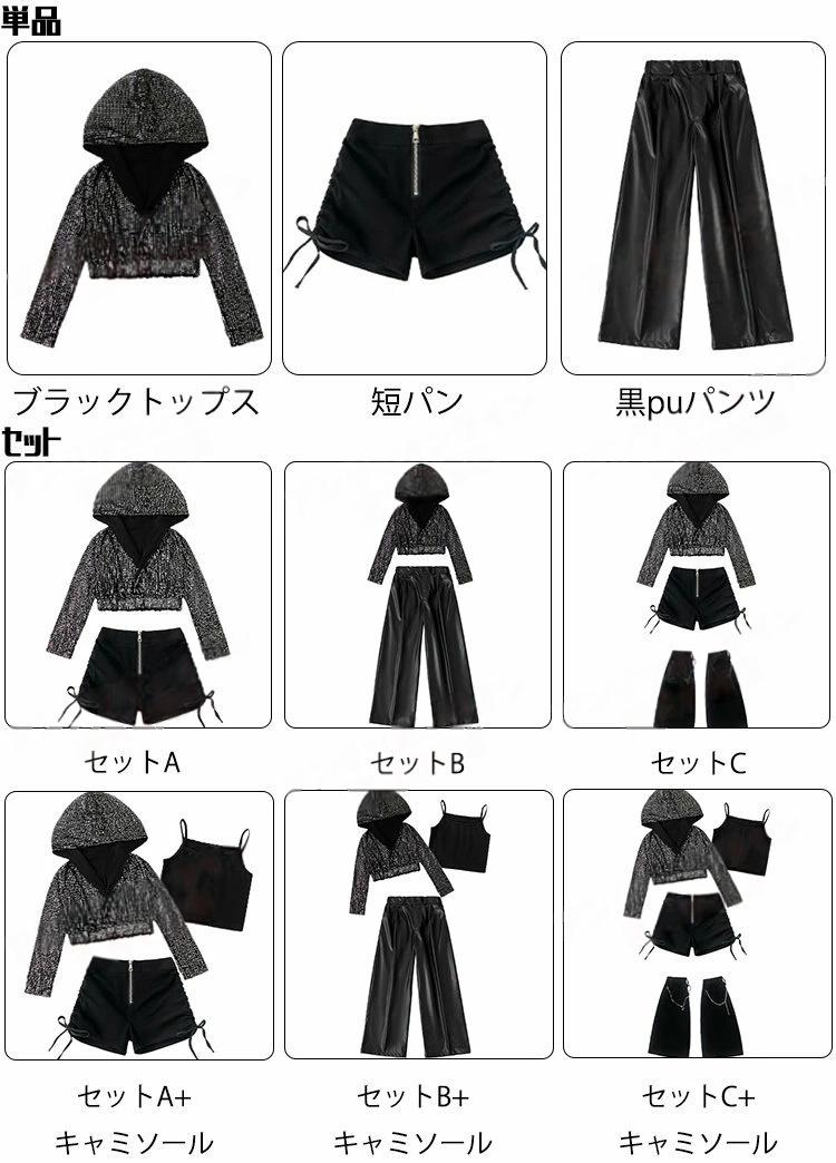 商品内容: ブラックトップスのみ 短パンのみ 黒色PUパンツのみ セットA セットB セットC セットA+キャミソール セットB+キャミソール セットC+キャミソール