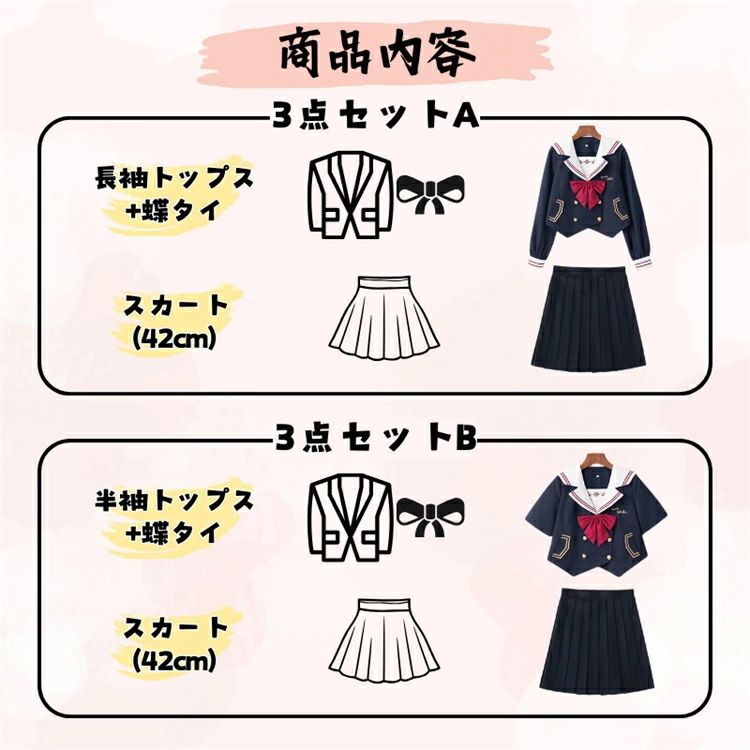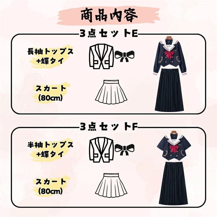 商品内容: 3点セットA 3点セットB 3点セットC 3点セットD 3点セットE 3点セットF 長袖トップス +蝶タイ 半袖トップス +蝶タイ スカート(42cm) スカート(65cm) スカート(80cm)