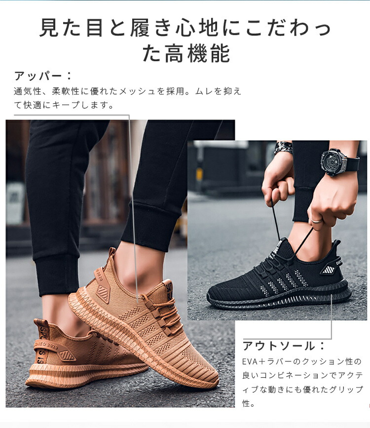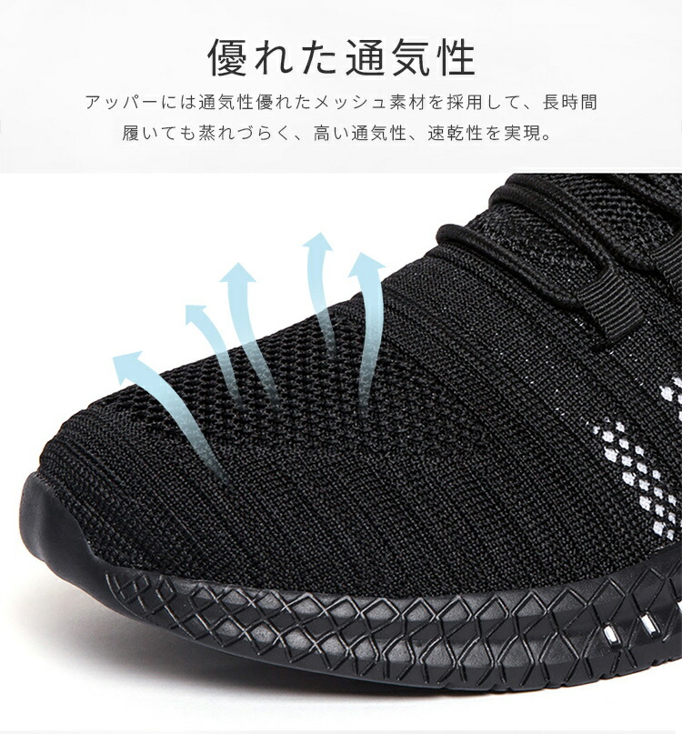 アッパーには通気性優れたメッシュ素材を採用して、長時間履いても蒸れづらく、高い通気性、速乾性を実現。