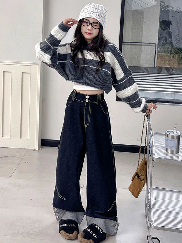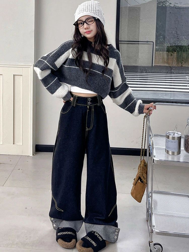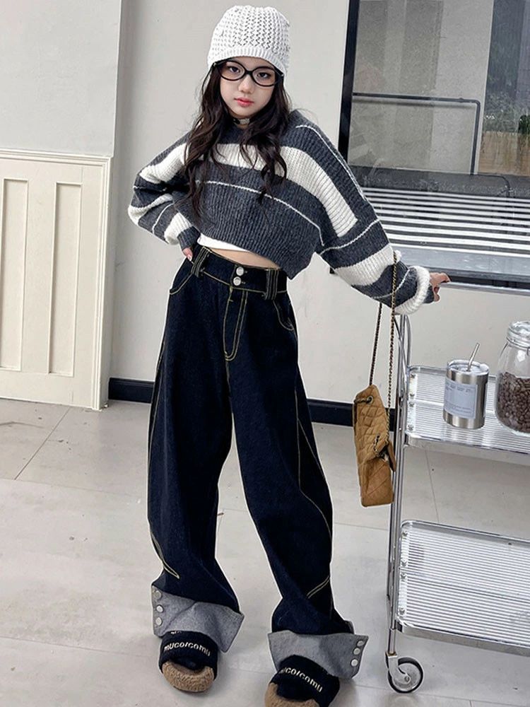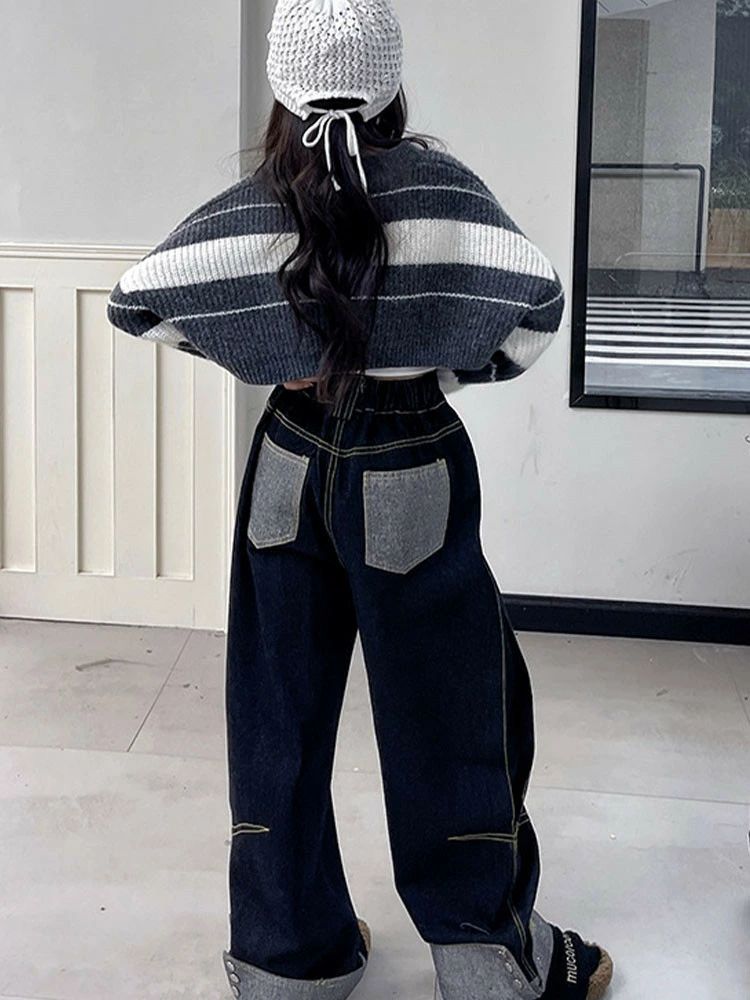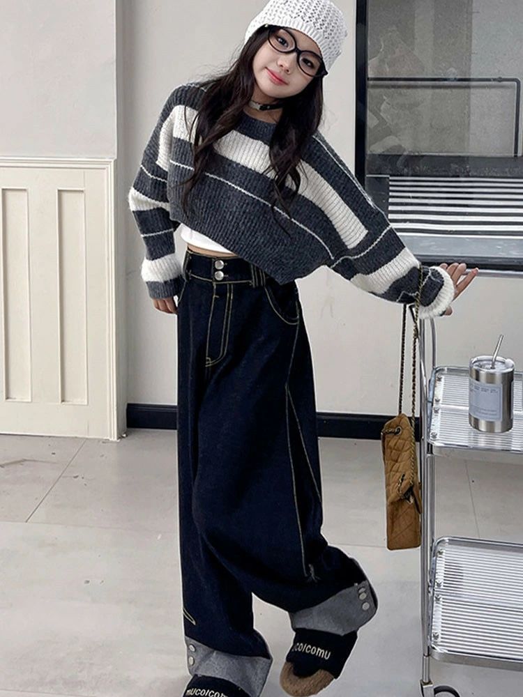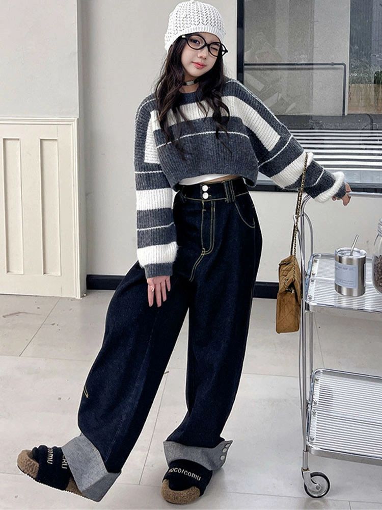 ストライプ柄 セーター デニムパンツ