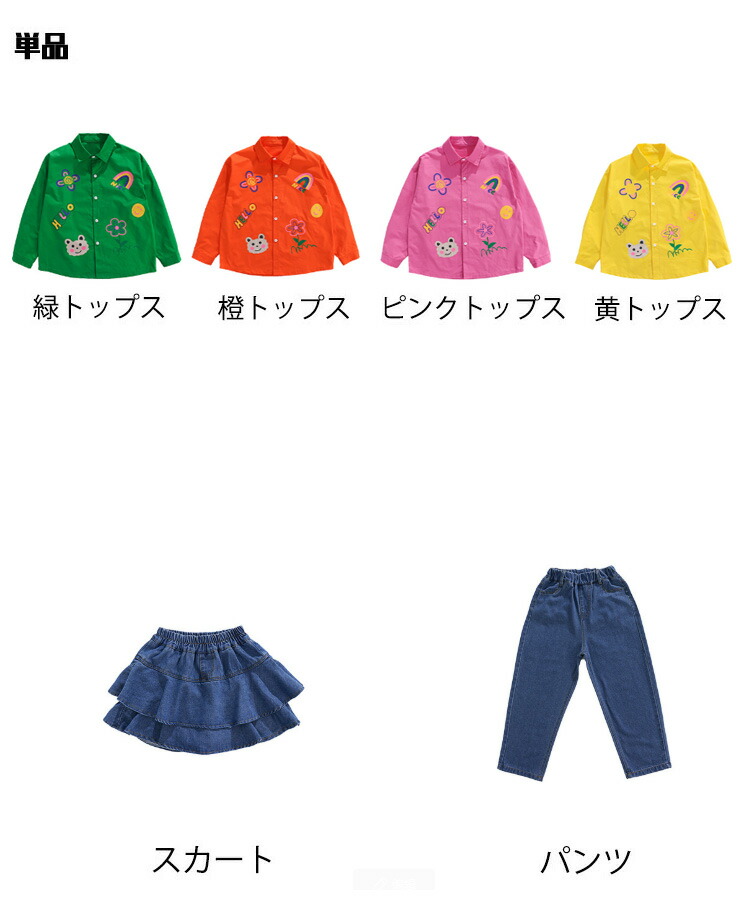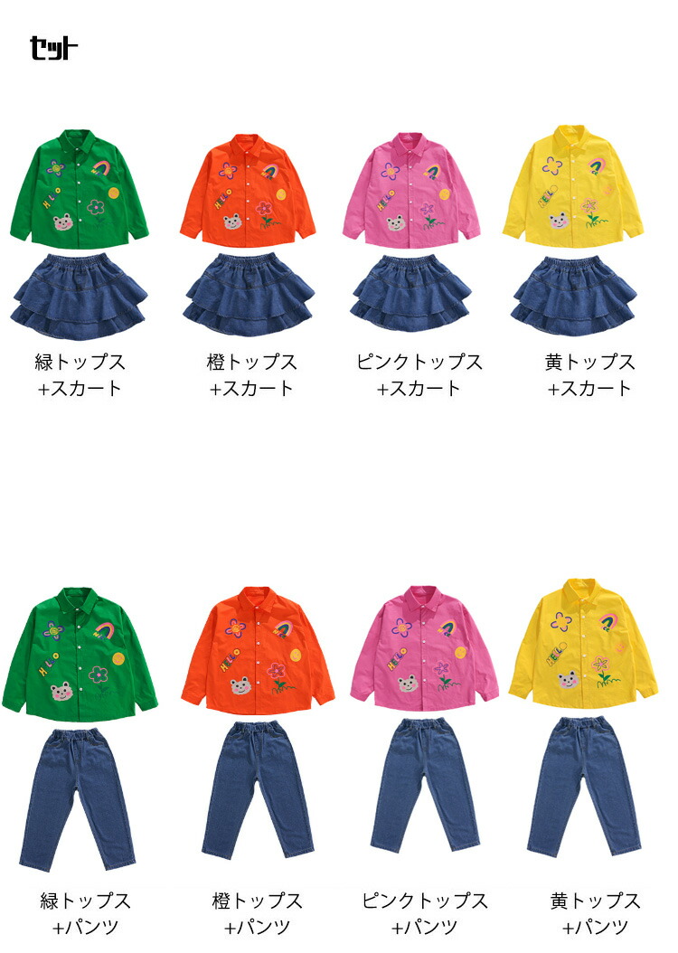 商品内容: 緑トップス 橙トップス ピンクトップス 黄トップス スカート パンツ 緑トップス+スカート 橙トップス+スカート ピンクトップス+スカート 黄トップス+スカート 緑トップス+パンツ 橙トップス+パンツ ピンクトップス+パンツ 黄トップス+パンツ
