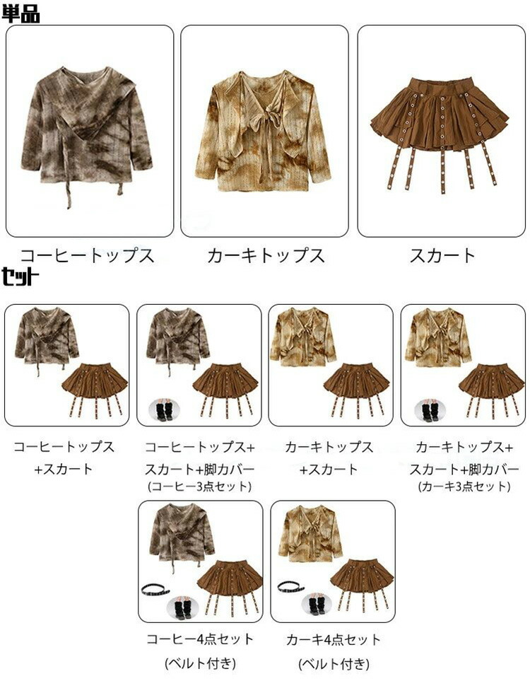 商品内容: コーヒートップスのみ カーキトップスのみ スカートのみ コーヒートップス+スカート コーヒートップ+スカート+脚カバー カーキトップス+スカート カーキトップス+スカート+脚カバー コーヒー4点セット カーキ4点セット