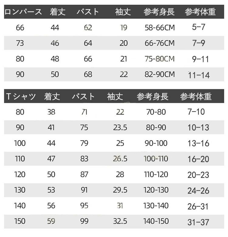 size: ロンパース66 ロンパース73 ロンパース80 ロンパース90 80 90 100 110 120 130 140 150 S M L XL 2XL 3XL 4XL