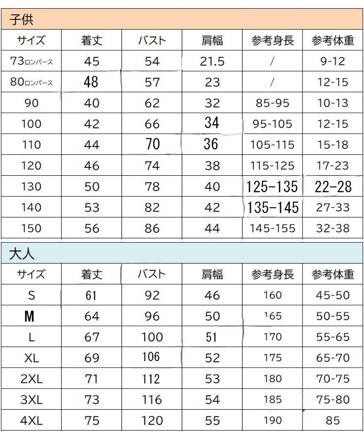 size: 73ロンパース 80ロンパース 90 100 110 120 130 140 150 S M L XL 2XL 3XL 4XL