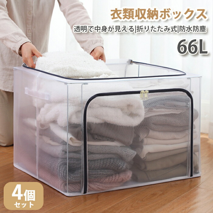 収納ボックス 収納ケース 衣装ケース 折りたたみ 大容量 透明 66L 取っ手付き PVC 衣類収納ボックス 通気性 収納BOX 4個set