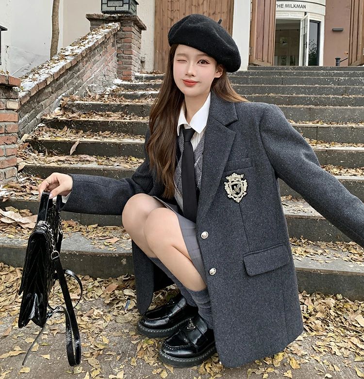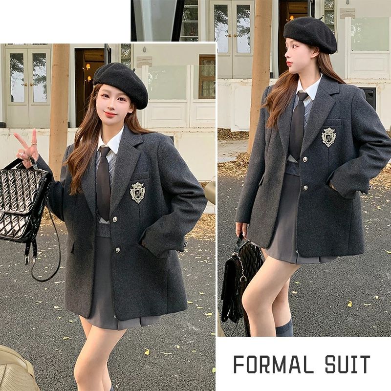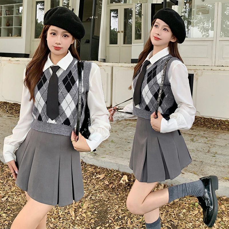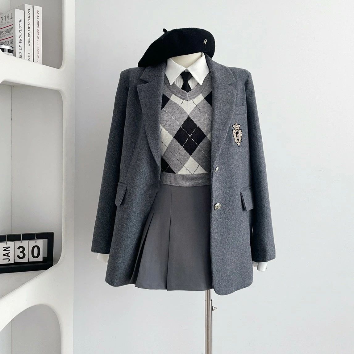 卒業式 スーツ 女の子 卒服 韓国 制服 入学式 女子 高校生 中学生 グレー フォーマルスーツ 可愛い 子供服 大きいサイズ 4点セット 格子柄 ニット ベスト ジャケット スカート 秋冬