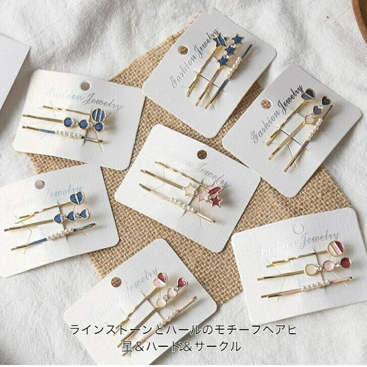 ヘアピンラインストーンとビーズのモチーフミニヘアピン3点セットスター&ハート&サークルキッズジュエリー アクセサリー レディースジュエリー アクセサリー ヘアアクセサリー ヘアピン
