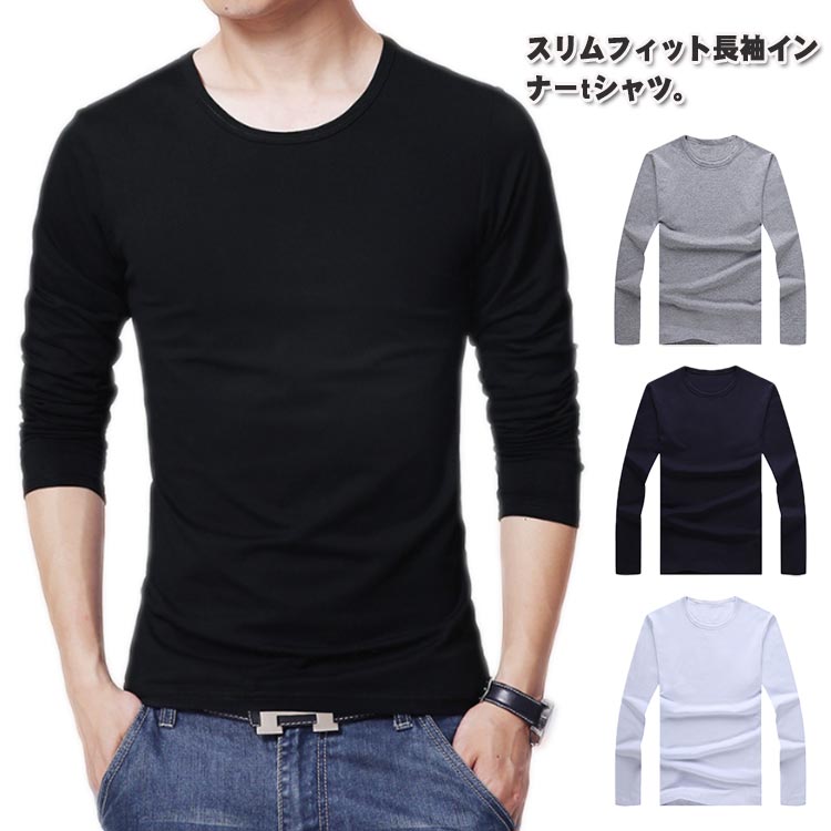メンズ インナーシャツ 長袖シャツ シャツ 長袖 ネック 丸首 スリム 細身 無地 プルオーバー