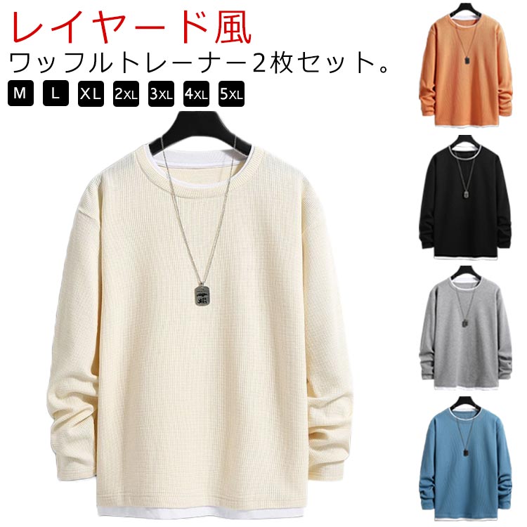 トレーナー メンズ 無地 長袖トレーナー スウェット ワッフル プルオーバー トップス レイヤード風 カジュアル トップス 裾レイヤード 重ね着風