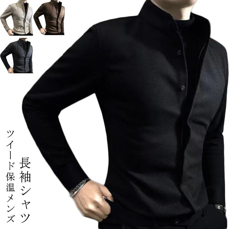 秋冬 ツイード保温 メンズ 長袖 シャツ ハンサム 立ち襟 シャツブラウス 長袖トップス 大きいサイズ