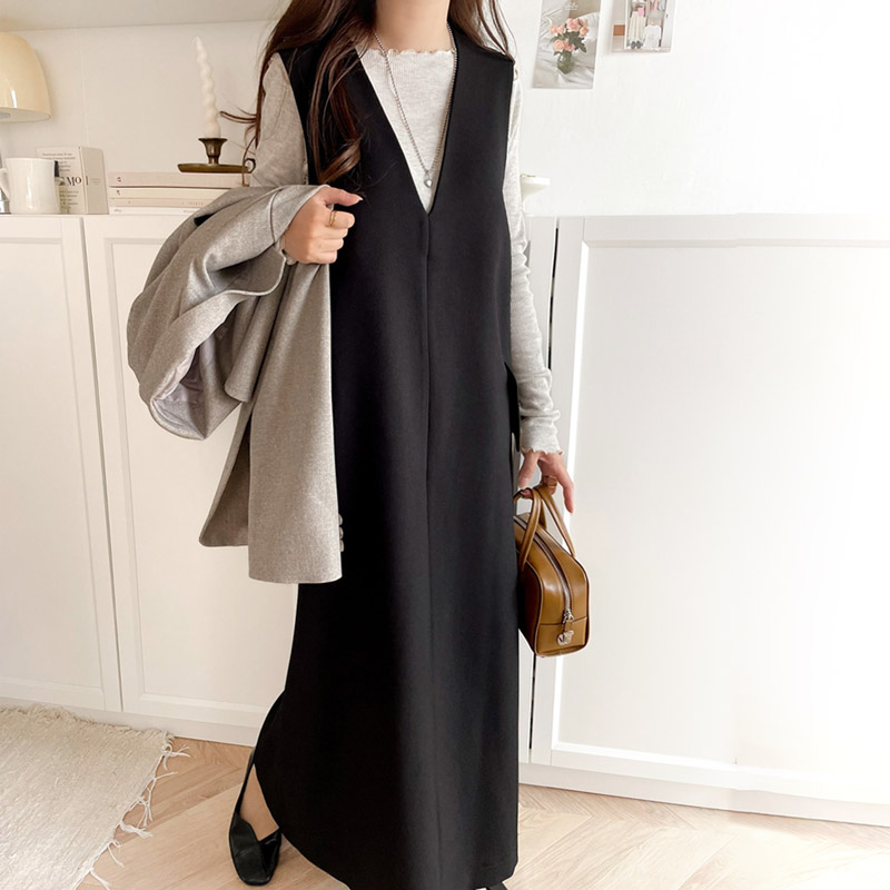 ワンピース レディース ネック 深い シンプル バックスリット 軽量 すっきり 高見え ゆったり 体型カバー 着痩せ 華奢 オールシーズン