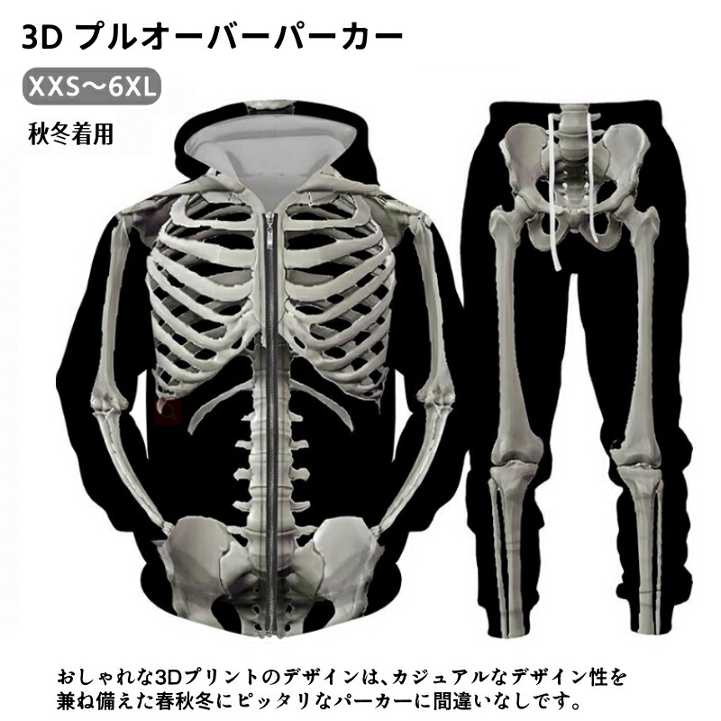 ジャージ 上下 ジップアップ メンズ フードパーカー 3D セットアップ どくろ柄 ハロウィン プルオーバー 長袖 吸汗 ゆったり 柔らかい 面白い