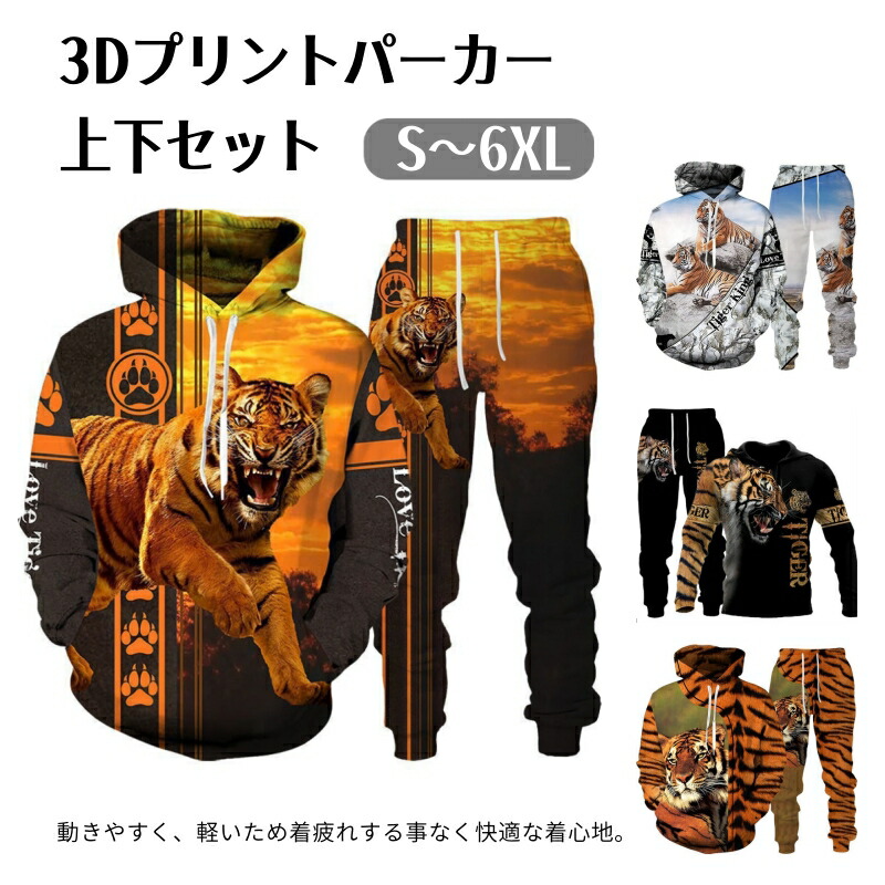 スウェットパーカー セットアップ 上下 3D ライオン柄 メンズ ジャージ ジップ フード 上着 ジャージ パーカー プルオーバー フード付き 長袖 通気速乾 オシャレ