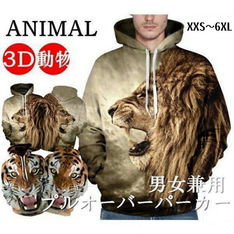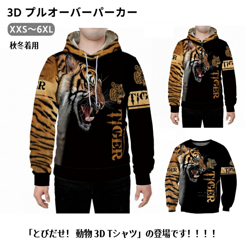 パーカー メンズ レディース プルオーバーパーカー 秋冬 長袖パーカー アニマル 3 虎 タイガー ライオン プルオーバー フードつき