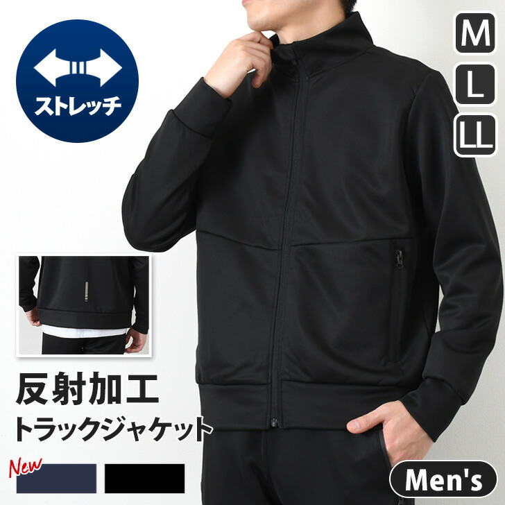 反射加工 ストレッチトラックジャケット メンズ ジャージ ウェア トップス 上着 アウター 長袖 おしゃれ 無地 黒 ブラック 速乾 ドライ カジュアル スポーツ 運動 トレーニング ジム ダンス ウ