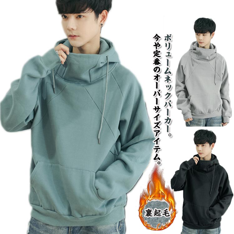 裏起毛 パーカー メンズ ボリュームネック ハイネック プルオーバー フード付き ビッグシルエット 大きめ 原宿風 大きいサイズ