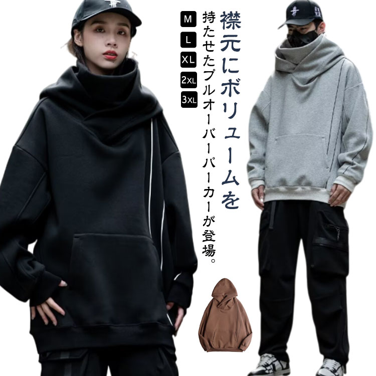 秋冬服 裏起毛 パーカー メンズ ボリュームネック ハイネック プルオーバー フード付き ビッグシルエット 大きめ 原宿風 大きいサイズ hiphop ヒップホップ