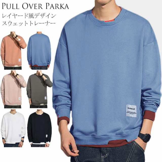 長袖 パーカー パーカ フェイクレイヤード風 スウェットトレーナー クールネックメンズファッション トップス パーカー