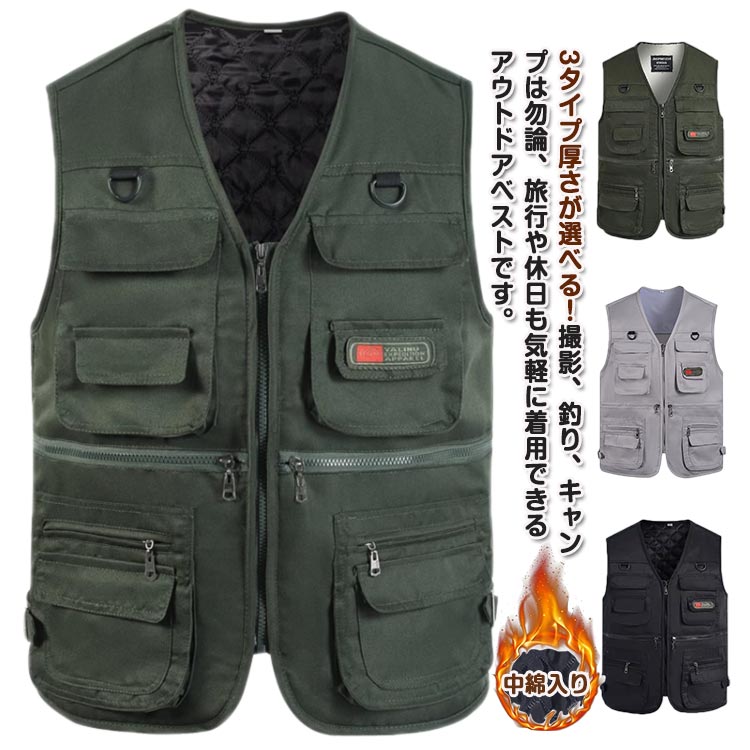 メンズ ベスト 作業ベスト 大きいサイズ 裏起毛 中綿入り 薄手 3タイプ厚さ ノースリーブ 多機能 ベスト 防寒