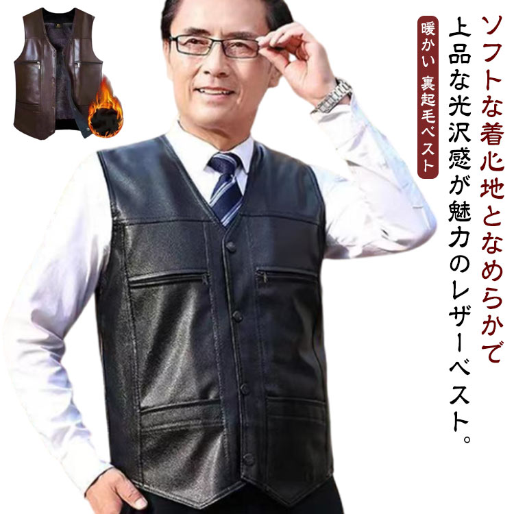 前開き レザーベスト メンズ 革ベスト チョッキ 裏起毛ベスト ノースリーブ 通勤 カジュアル フォーマル 大きいサイズ ライダースベスト 老人 高齢者 部屋着